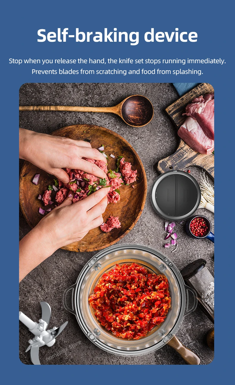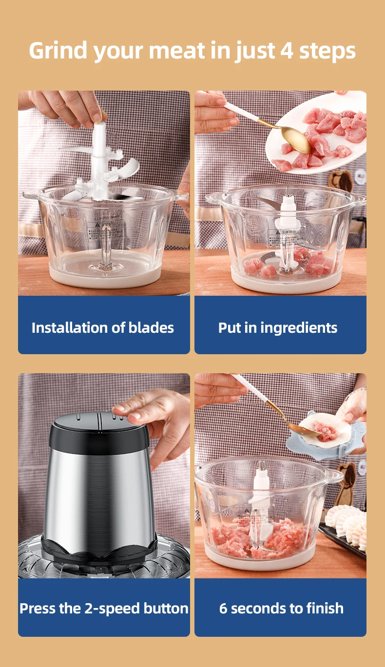 1. This electric meat grinder adopts pure copper motor, rotor copper wire, stator copper clad aluminum wire, each time can chop, mix, pound into mud, mix, chop to perfect texture. With this blender, it’s easier than ever to prepare delicious meals for loved ones.