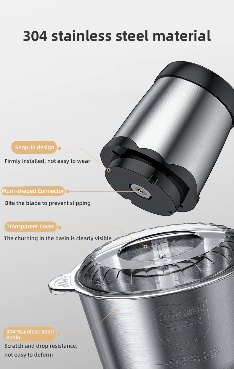3. This meat mincer adopts 300W high power, upgraded and reinforced double four-dimensional blade, S-shaped machete, upper and lower two layers of blade, using the effect of force, whirlwind stratified crushing, fast and delicate cutting food materials, improve the crushing efficiency.