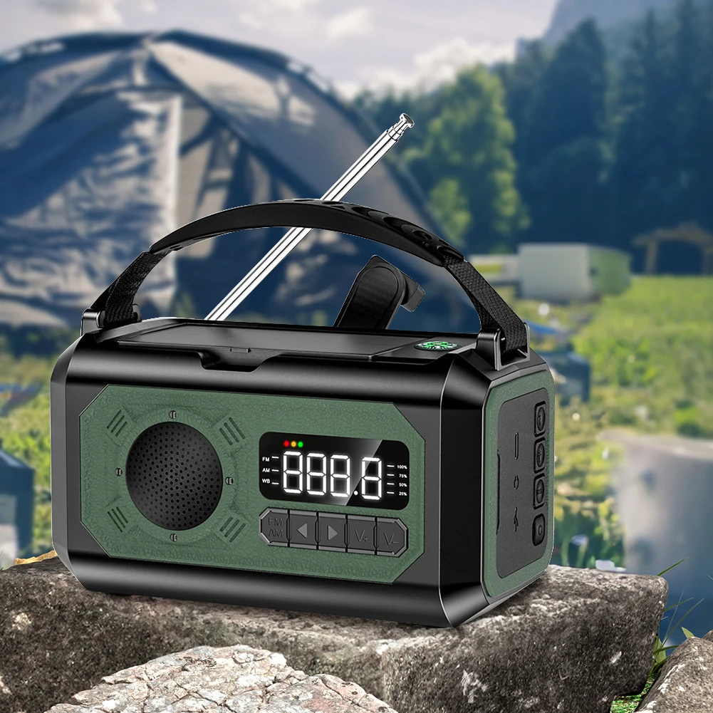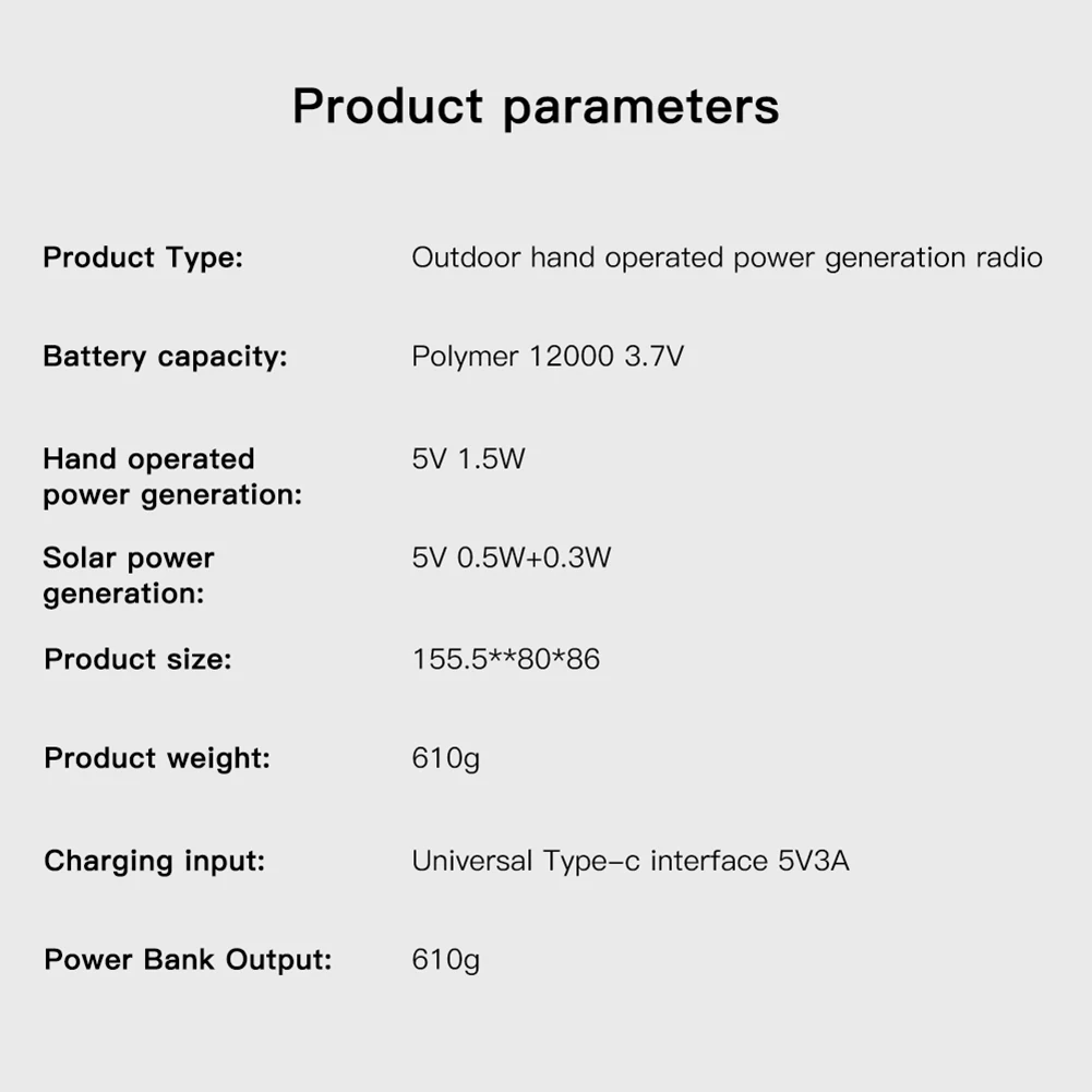 Feature: 1. 12000mAh Ultra Large Capacity: Say goodbye to the limitations of ordinary emergency weather radio. With a 12000mAh battery capacity, it can charge your smartphones, tablets, and other USB devices, ensuring your devices stay fully charged. (With outstanding battery life, providing you with up to 108 hours of extended usage time). The Type-C interface supports 5V3A fast charging, eliminating the wait for slow charging. 2. Dual Solar Charging Panels: The weather alert radio equipped with dual solar panels (5V 0.5W+0.3W) on the top, made from monocrystalline silicon material, the large solar panels efficiently convert sunlight into power. Charge in outdoor areas with abundant sunlight, eliminating worries about battery depletion and embracing the future of emergency communication. 3. Advanced NOAA Weather Alerts: With frequent disasters, a special emergency am/fm/noaa weather radio becomes a necessity. Our enhanced NOAA weather radio captures NOAA/AM/FM signals (AM: 520-1710 KHz / FM: 87-108 MHz / WB: 162.4-162.55 MHz). Stay informed, protected, and prepared to take action. Seamlessly access critical weather updates anytime, anywhere to safeguard your family and future. Note: NOAA feature is only available in the United States. 4. Multi-functional Radio: This multi-functional companion provides: 1.Power bank function 2. AM/FM/NOAA radio 3. Three-mode flashlight (high beam mode, low beam mode, high and low beam mode) 4. Reading LED light 5.SOS alarm 5.Headphone jack7.Compass. The upgraded digital display screen provides detailed channel and battery level information, enhancing your experience. The 15.3-inch extendable antenna ensures unparalleled signal reception, while the auto-channel search simplifies tuning to local broadcasts. 5. Essential for Home and Outdoor: A thoughtful gift that is an integral part of your emergency kit. It features a hand crank function, allowing you to generate power even when there is no electricity. Harness the power of preparedness for unpredictable natural disasters-equip your loved ones with this portable radio for crucial moments before the storm. Compact and lightweight, measuring 6.14×3.39×3.15 inches. Equipped with a practical handle, it’s your reliable partner in any situation. Rely on this portable emergency radio for emergency preparedness during hurricanes, tornadoes, and blizzards.