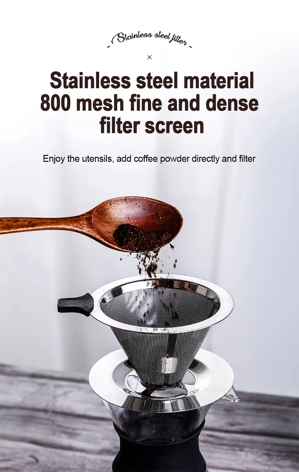 Coffee filter dripper made of high quality 304 stainless steel material, non-toxic, safe and durable to use. Using our this coffee filter, you can get a perfect cup of coffee: The double-layer stainless steel filter doesn't absorb oils or flavors from coffee beans like traditional filters, ensuring a flavorful cup of coffee in each cup or small pot. Besides, the mesh coffee cone is designed to fit on most cups, mugs, thermoses, small pots, and even carafes, convenient for you to use. Nice product at a good price, worth buying.