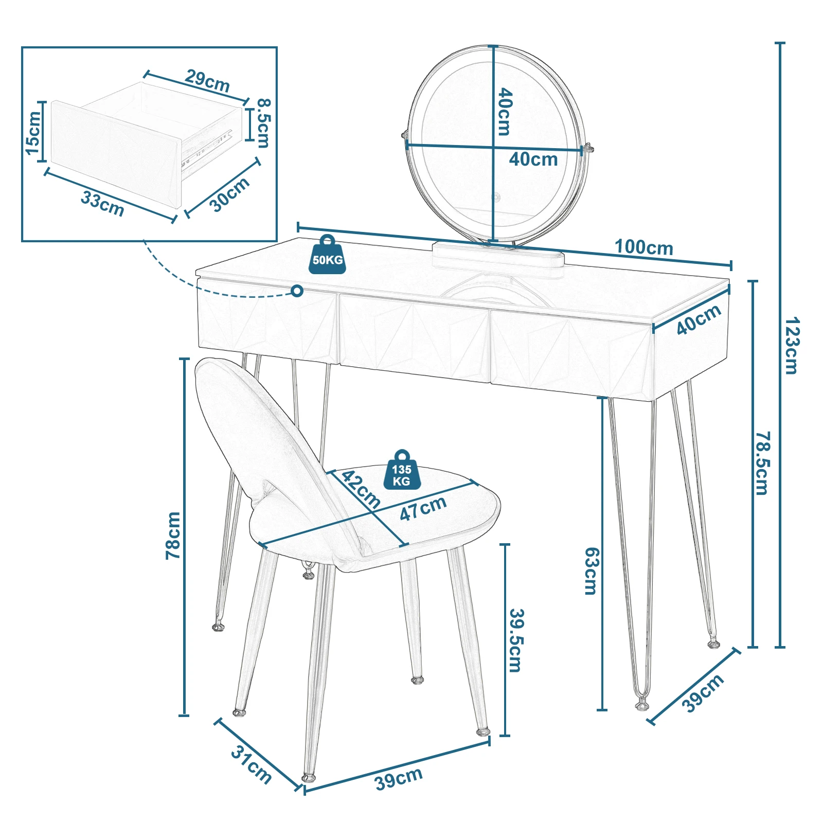 - Load capacity: dressing table: 50 kg; Chair: 135kg