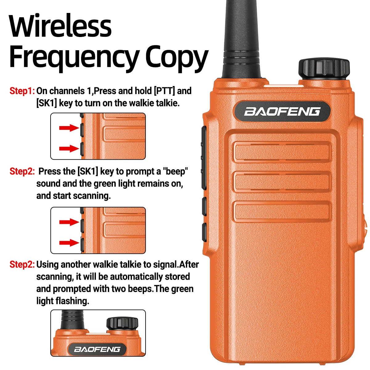 Press and hold [PTT] and [SK1] key to turn on the walkie talkie. Press the [SK1] key to prompt a “beep”sound and the green light remains on,and start scanning. Using another walkie talkie to signal.After scanning, it will be automatically stored and prompted with two beeps.The green light flashing.