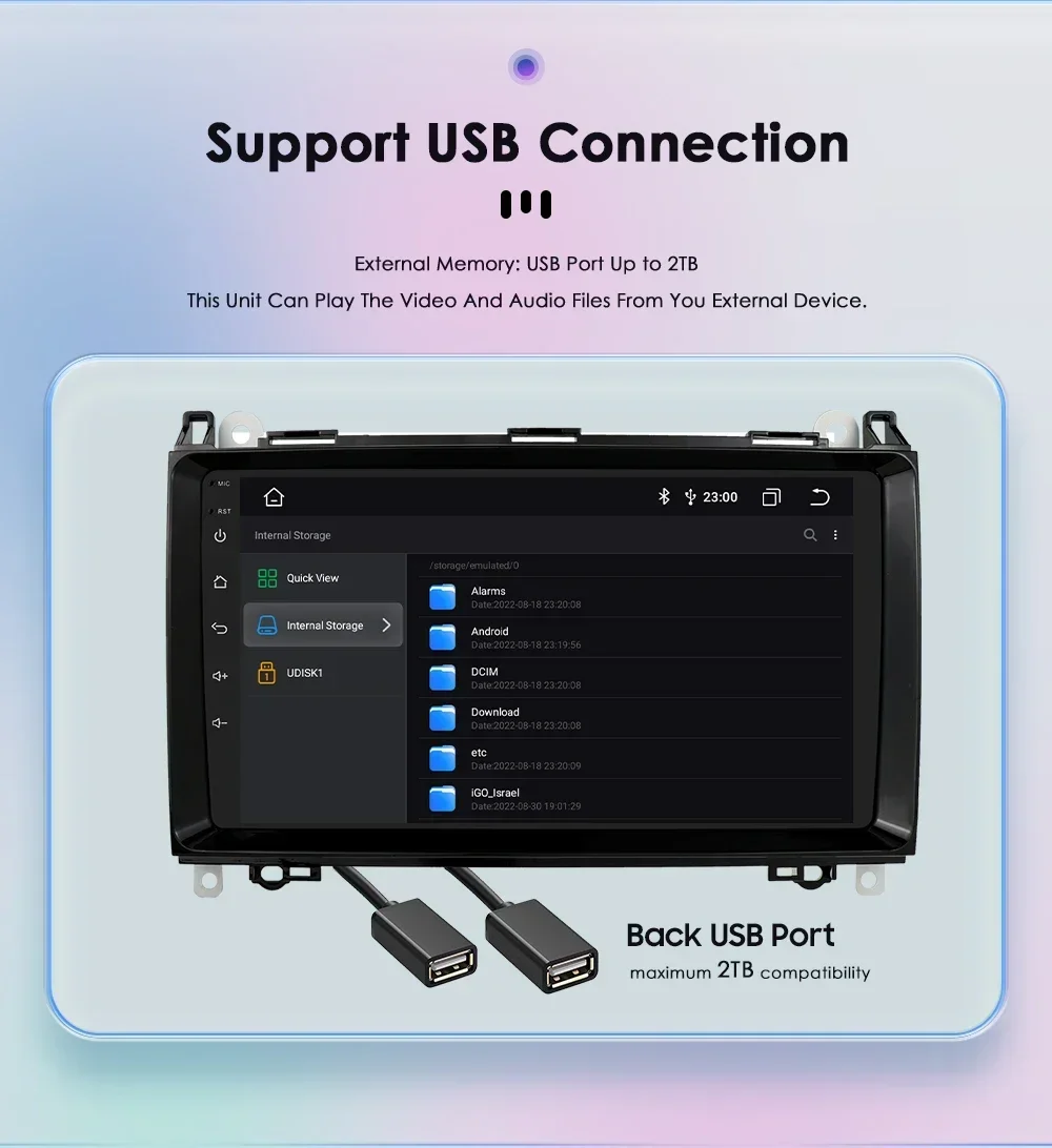 External Memory: USB port up to 2TB,this unit can play the video and audio files from your external device.