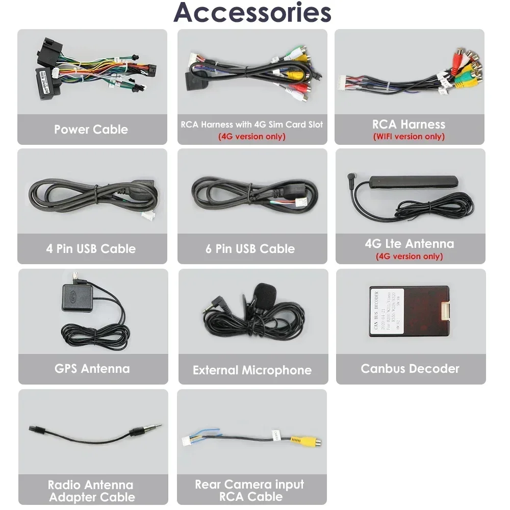 Standard Accessories: which ship with the head unit together(but please pay attension to the red words of accessory whether can get or not which depends on the item option you choose to buy it)