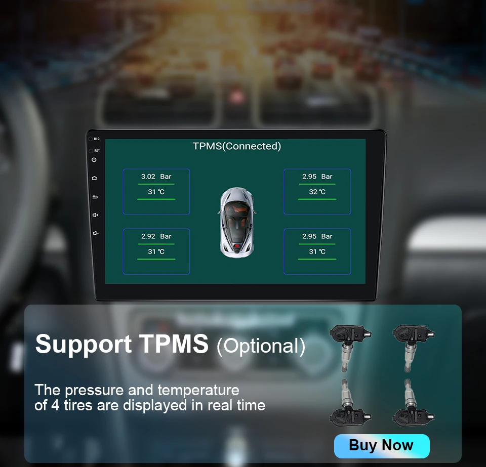 The intelligent four-tyre pressure detector realizes real-time temperature visualization. When the tire pressure or temperature limit is exceeded, an alarm will be activated immediately (TPMS sensors need to buy)Support more than 100 kinds of Menu language, you can choose it on the settings.
