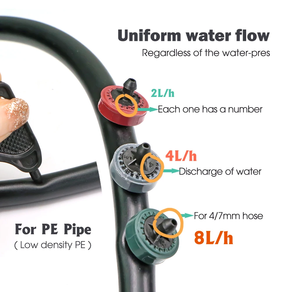 – Pressure compensated.The water flow is 2L/H or 4L/H or 8L/h of the dripper. this is a common size used on water filter systems, water coolers, and so on.Products using the new high-quality plastic, stable quality, can use for a long time. It is widely accepted by users.