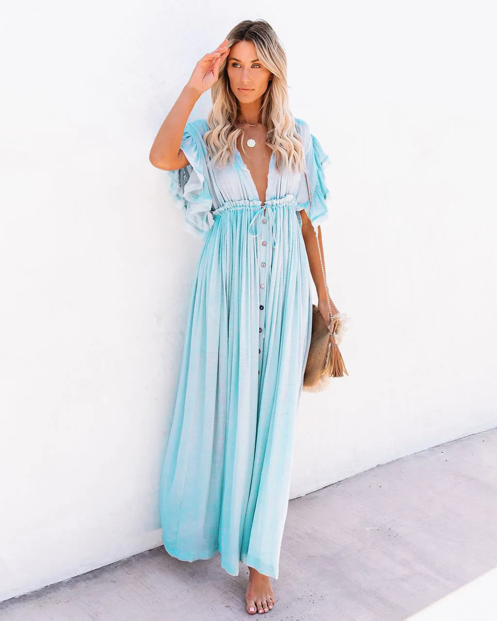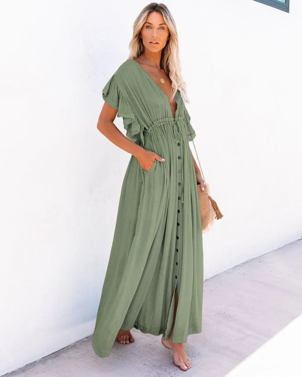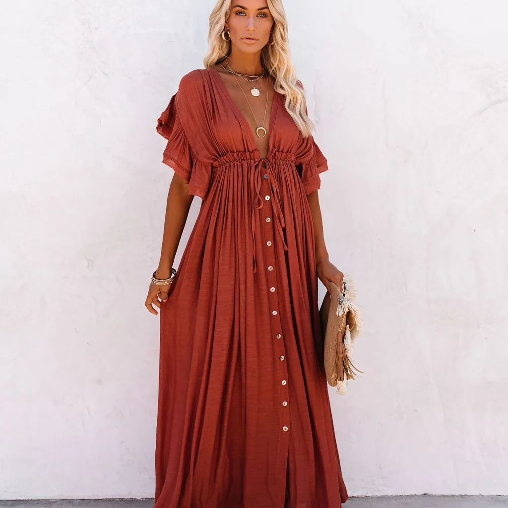 2024 Summer Long Bikini Cover Ups for Women Solid V-Neck Kimono Beach Dresses Lace Up Anti-Sun Swim Dress Bohemian Sarong Skirt