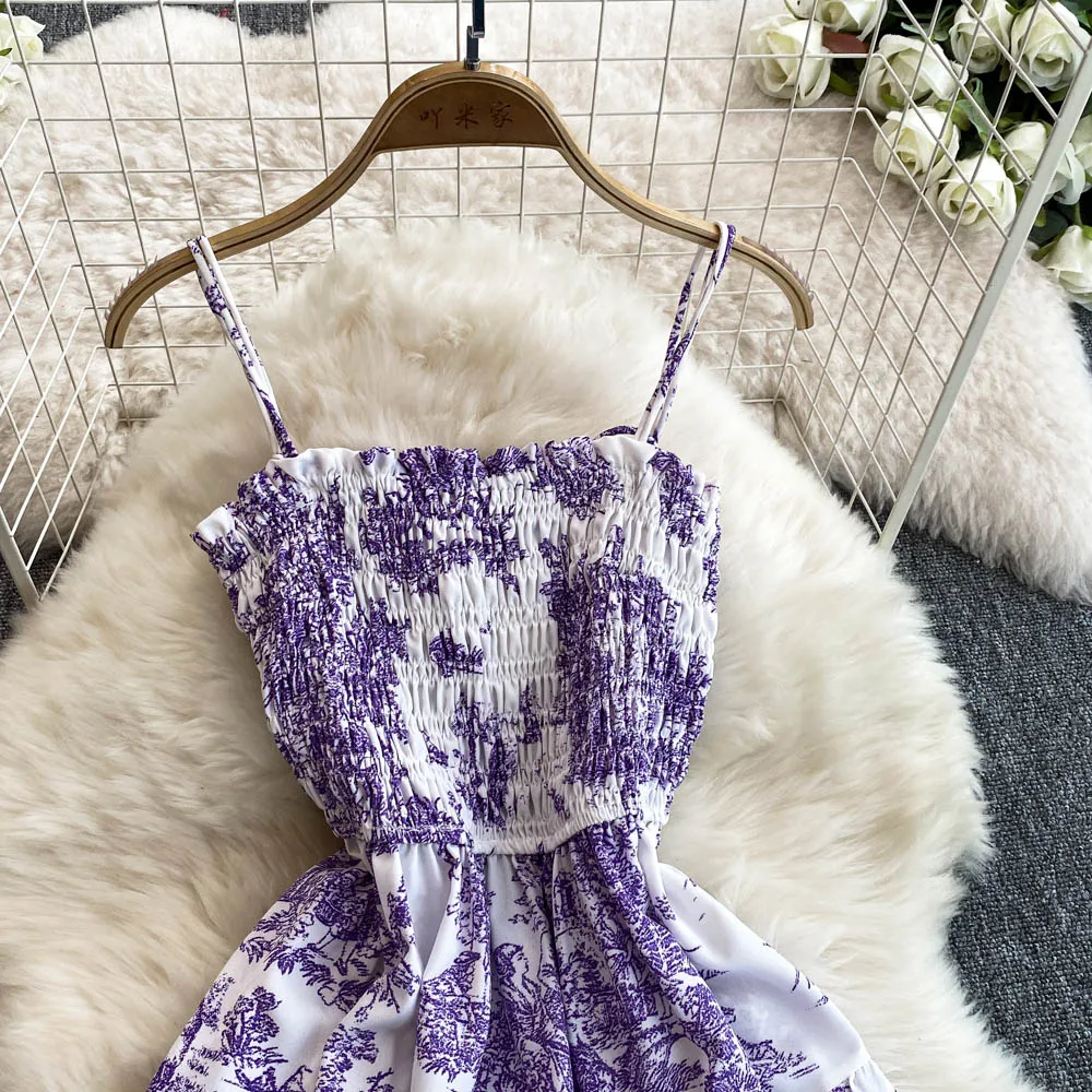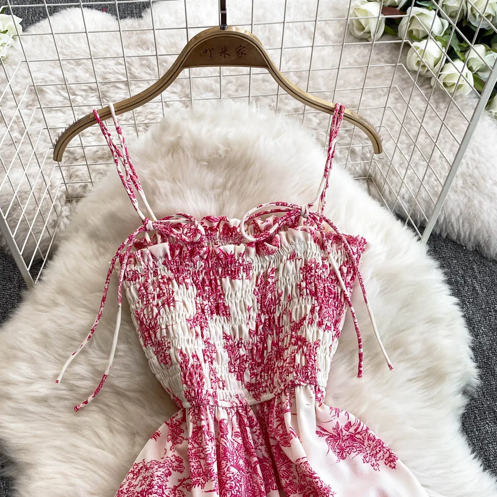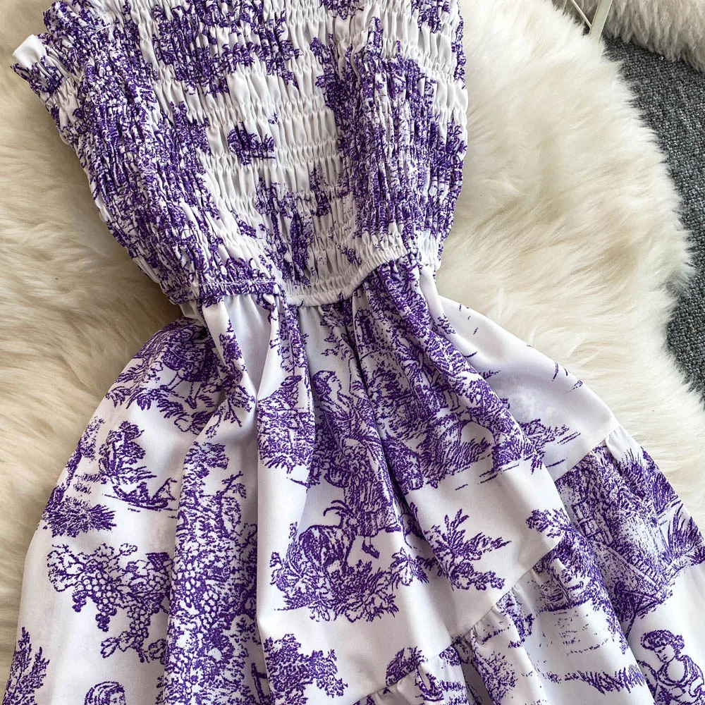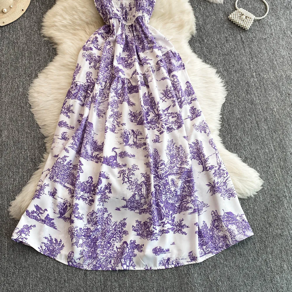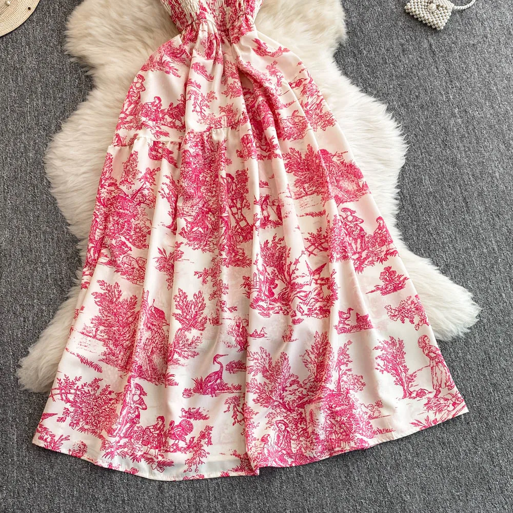 2025 New Summer Pink/Purple Flower Print Romantic Retro Party Dress Elastic High Waist Vacation Long Dress Beach Vestido