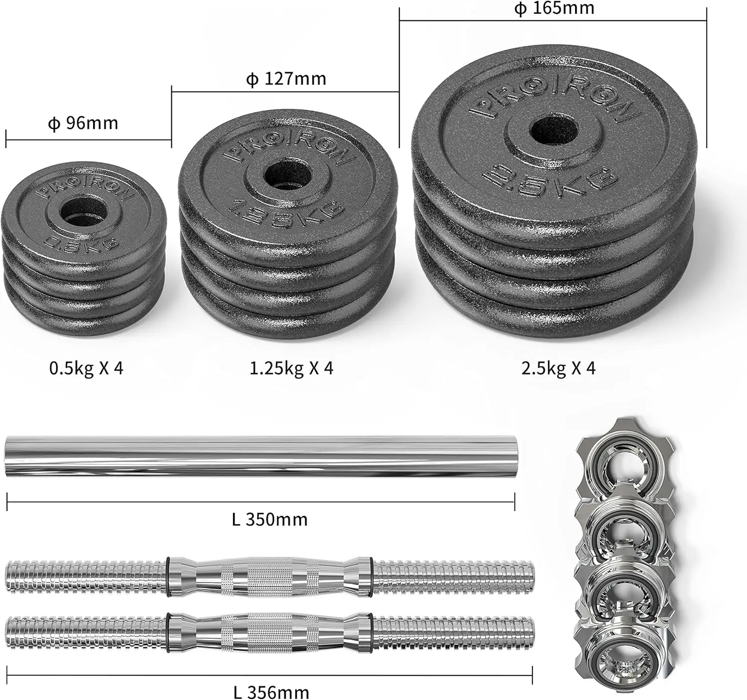 Set of weights(0.5kg*4, 1.25kg*4, 2.5kg*4), Lock*4, handle*2, Dumbbell Connector*1