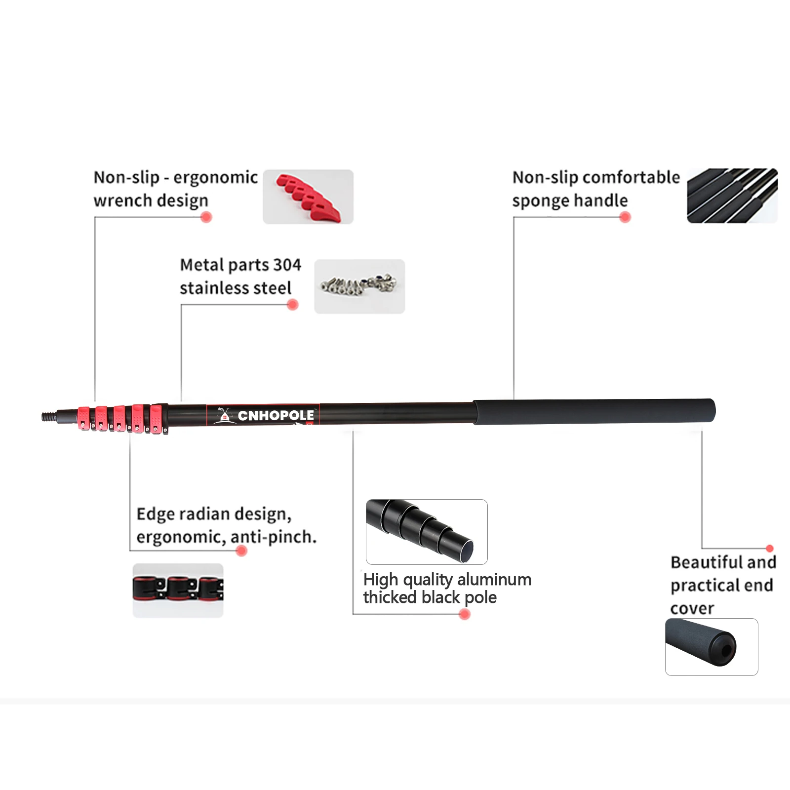 2,SAVE TIME/EFFICIENT/HEAVY DUTY:Only need to safely stand on the ground without a ladder, and you can reach a height of up to 24/30/36/40FT(any custom lengthup to 24ft If you choose 24ft) for your work.With American thread((3/4” ACME Threaded Pole Tip) and other customized you want.It has a thicker tube-wall and a reinforced lock device,so it is strong enough.