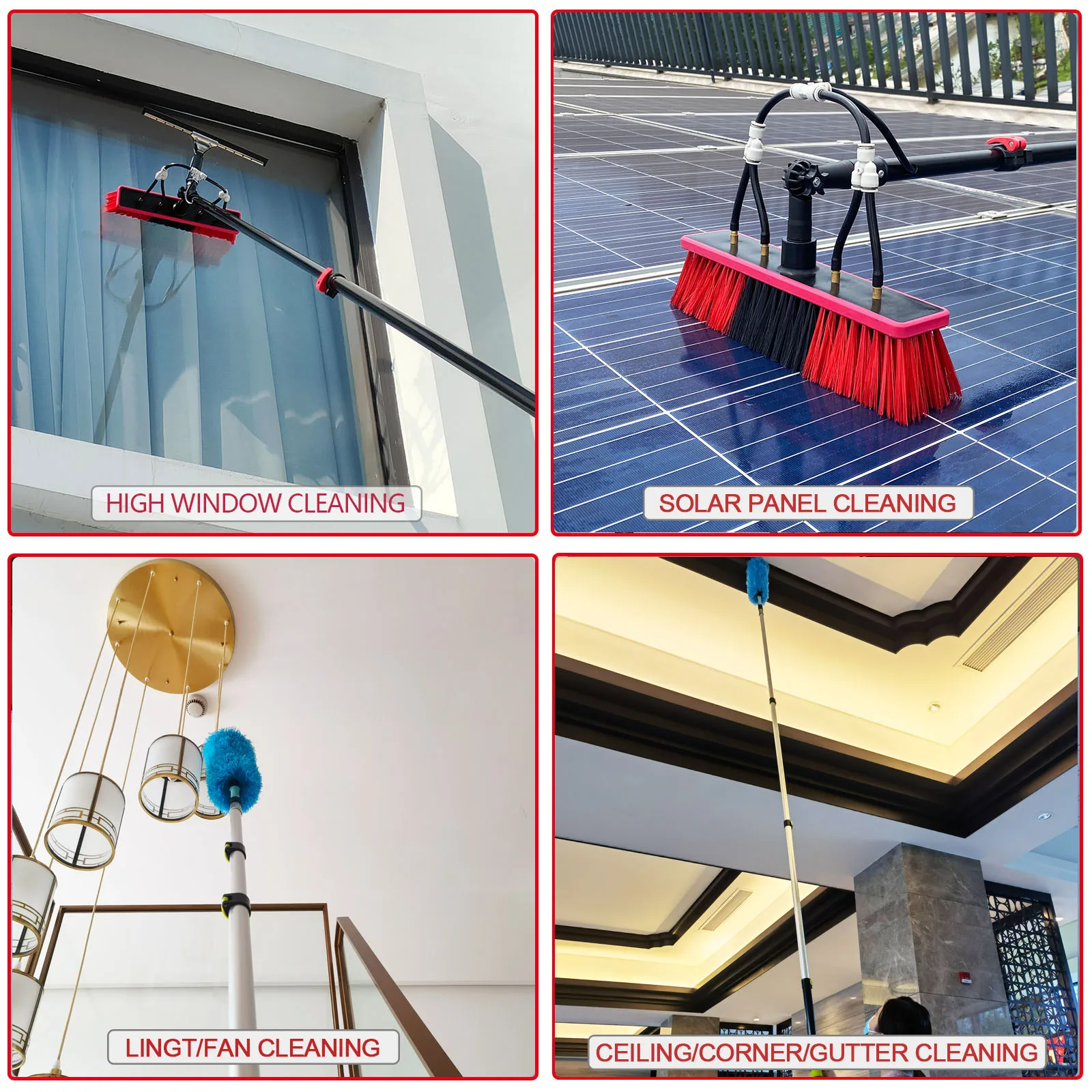 3,VERSATILE, MULTIPURPOSE:Use with Twist-On Household Tools. Simply twist-on the householdtool of your choice: Water flow through brush,window cleaning,solar panel cleaning,Paint Roller, Squeegee, Cobweb Duster, Ceiling Fan Duster, Feather Duster, Mop, Broom, Fruit Picker, Light Bulb Changer, Utility Hook, and others! Works with all Attachments.
