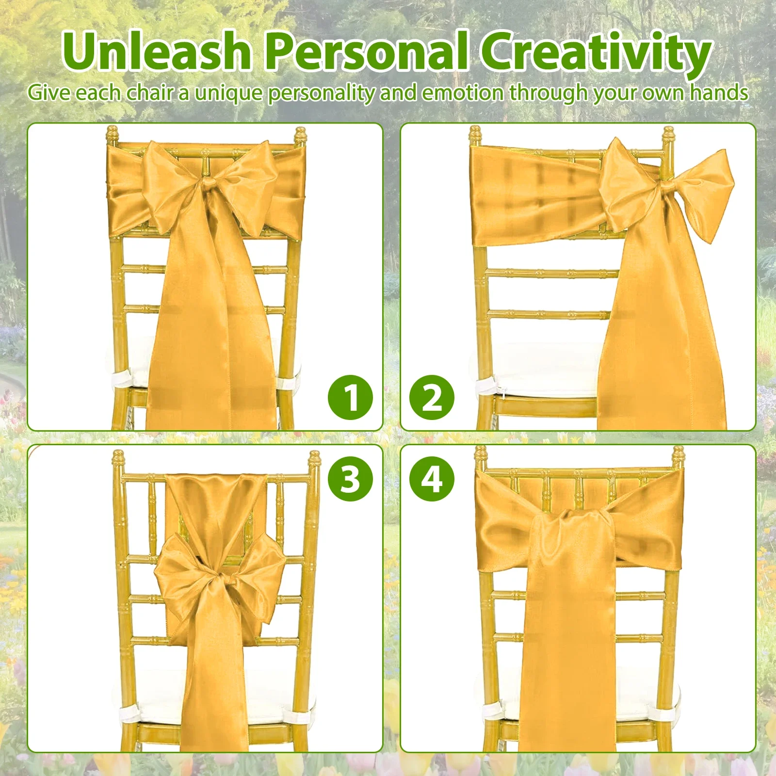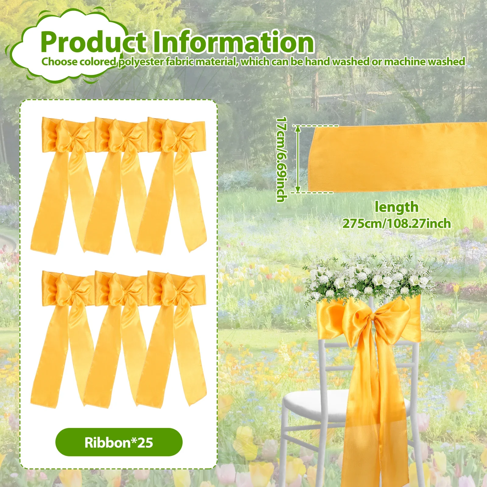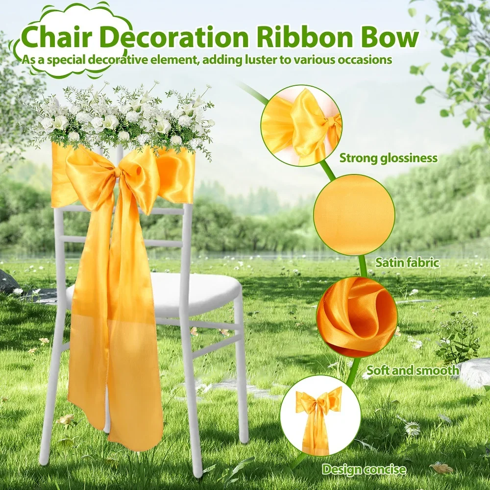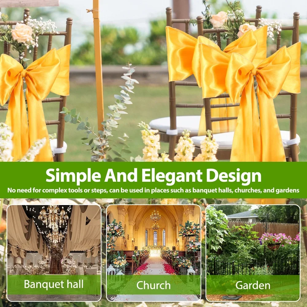 Easy to Install: The satin chair sashes are minimalist and generous. Wrap around the back of the chair and tied into a beautiful bow, it can be easily done in minutes. No complicated tools or steps are needed, easily done in minutes. Suitable for banquet halls, churches, gardens, etc
