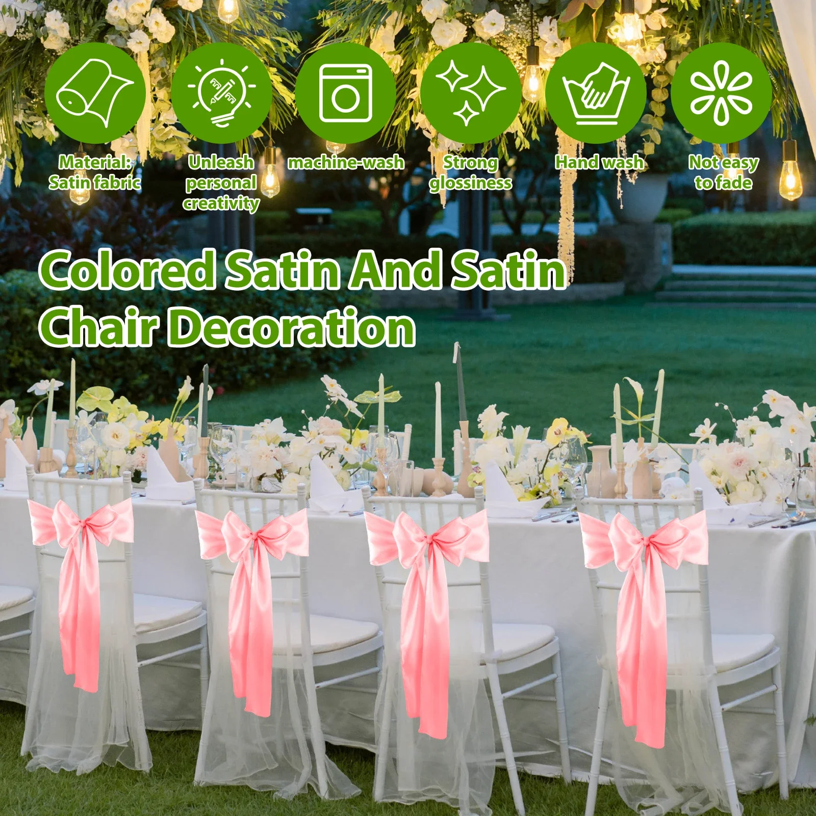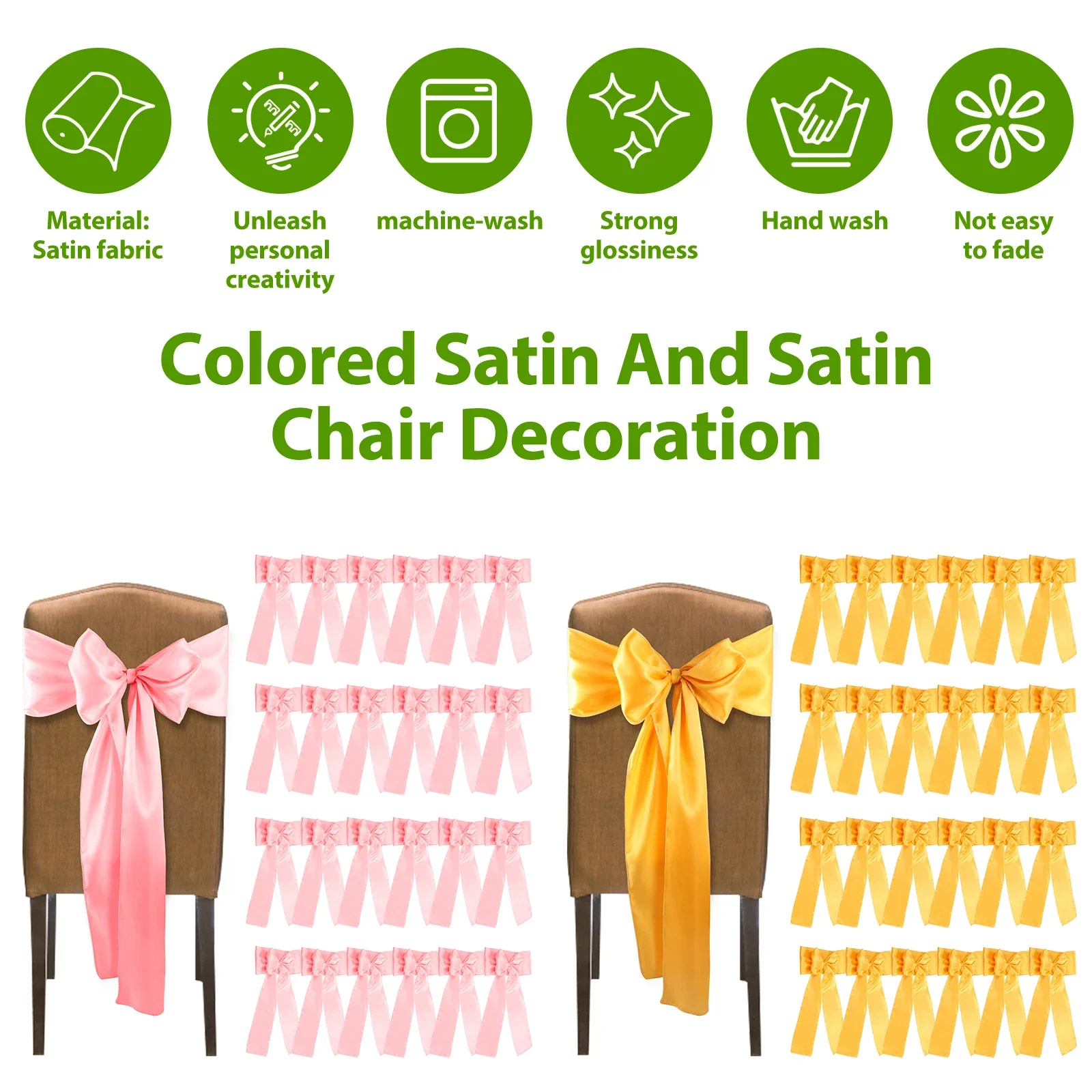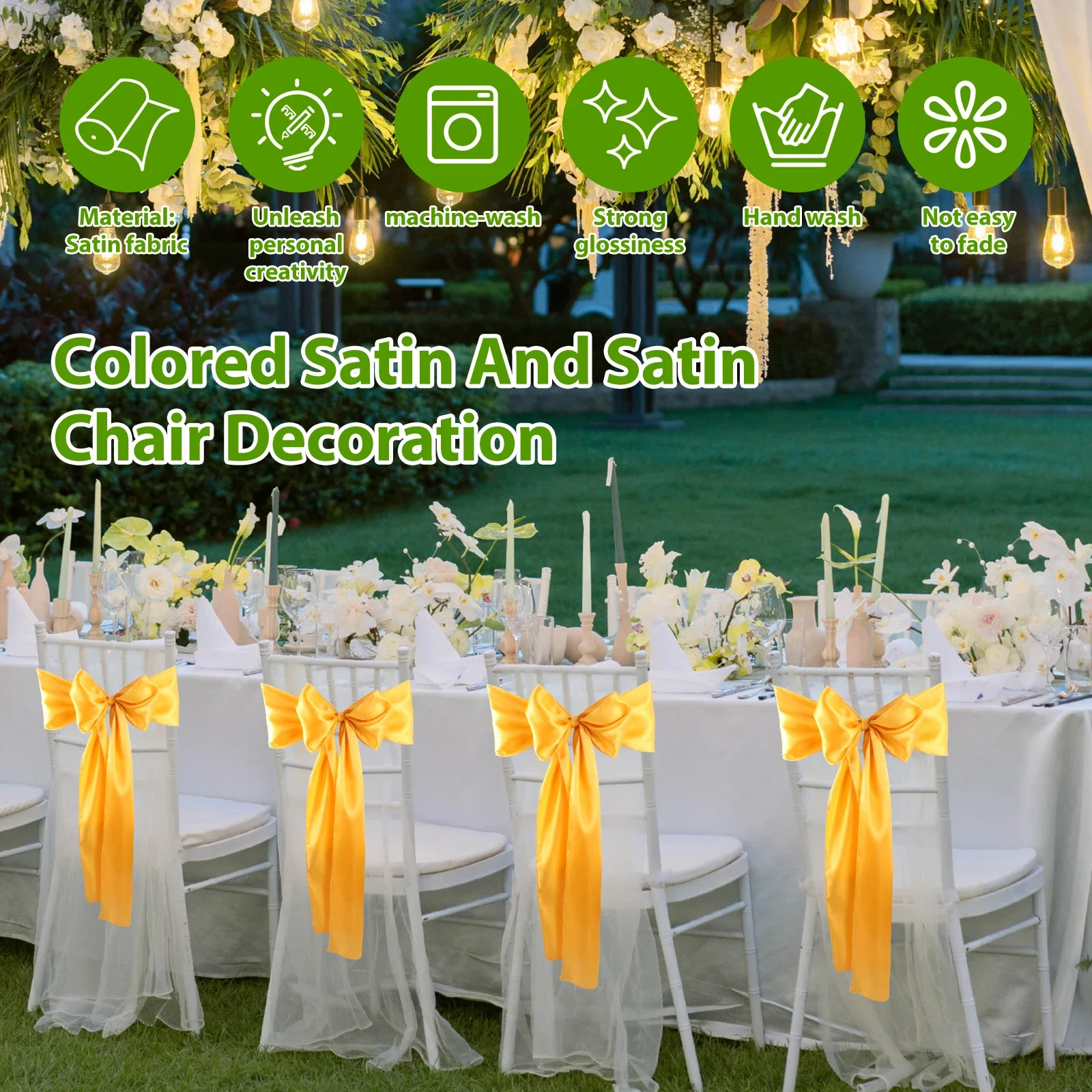 Quality: The satin fabric has good abrasion resistance and wrinkle resistance. Not easy to fade even after a long time of use. Easy to clean by hands or machine, low temperature ironing and drying, can not be bleached. Suitable for indoor and outdoor weddings, presenting excellent effect