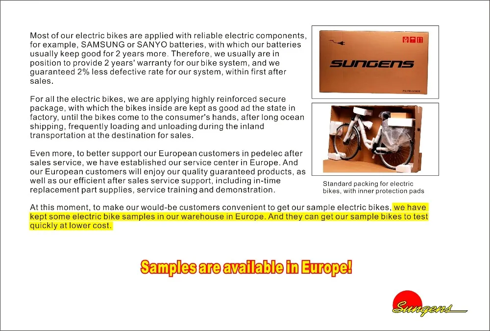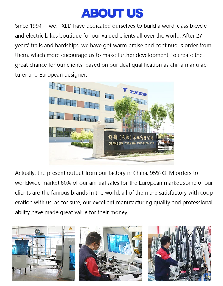A: We welcome you to order samples to check our quality and actual manufacturing value. Usually, in our China factory, it takes 3-4 weeks to get the sample bikes ready, after receipt of your full sample payment. Please feel free to contact us