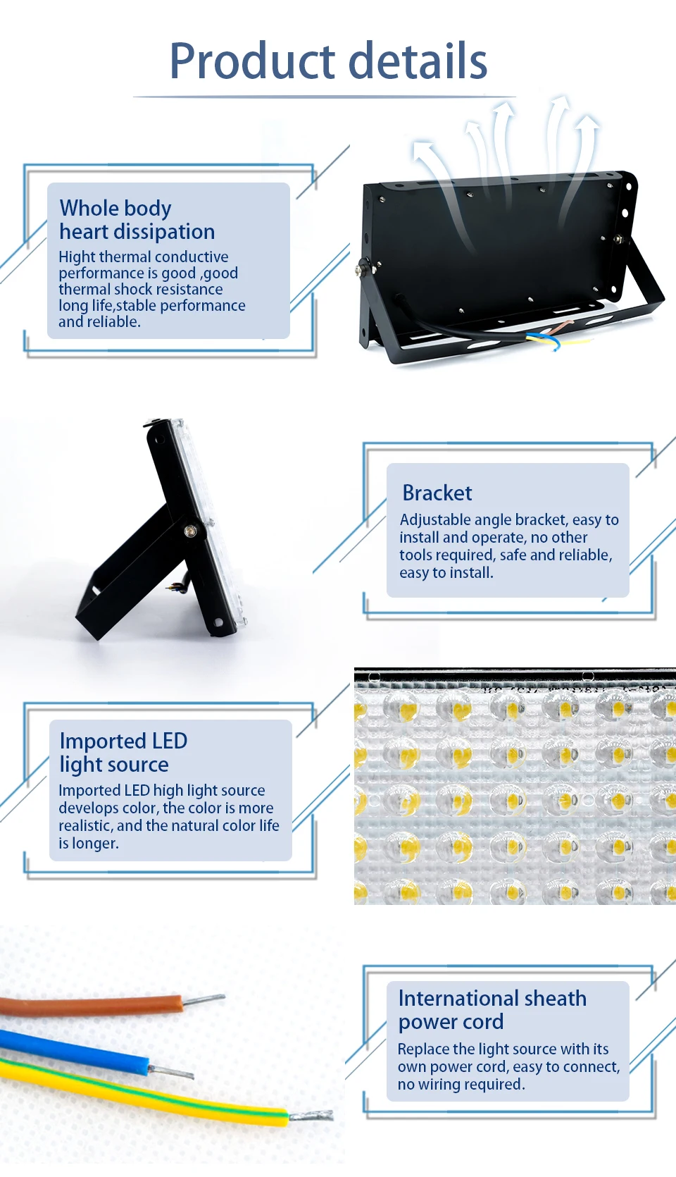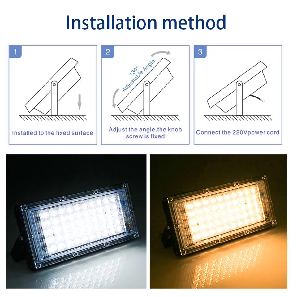 Facts: Our product is built with high quality chips.High quality ABS lampshade a solid high transmittance. Our LED Flood light is equivalent to 300W Halogen Bulb. The Floodlight also saves 80% of your energy as compared to traditional Halogen lamps. Lighten up your atmosphere with our LED Floodlight!
