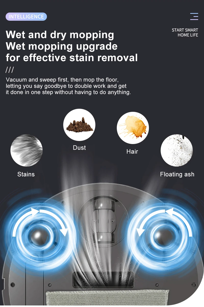 5. Wet and dry mopping, upgraded wet mopping effectively removes dirt. First suction and sweeping, then mopping the floor, allowing you to bid farewell to dual work without the need for manual intervention. Hair, dust, stains, and floating ash can all be absorbed