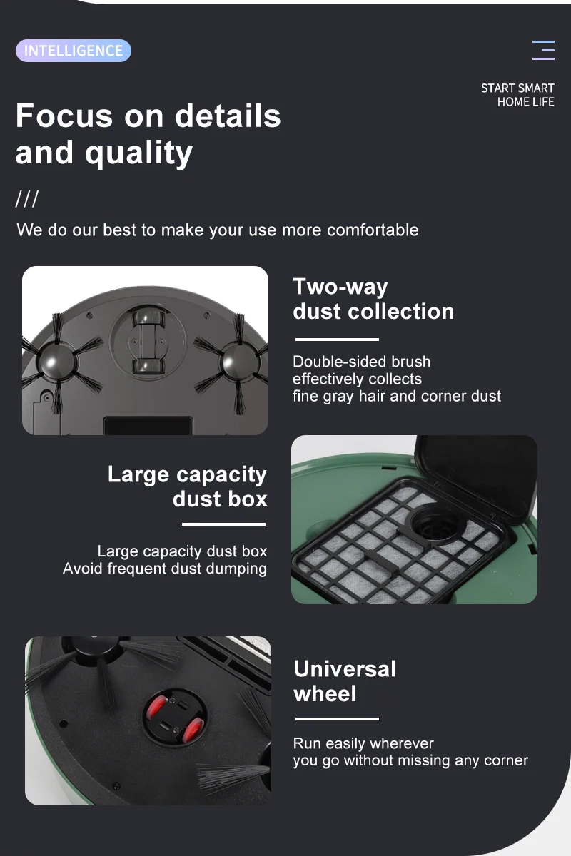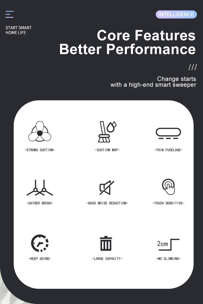 2. Core features, performing better. Change starts with a high-end intelligent sweeper. Powerful suction, integrated suction, drag and sweep, slim body, bi-directional gathering brush, low noise reduction, touch sensing, continuous range, large capacity dust storage box, unobstructed climbing