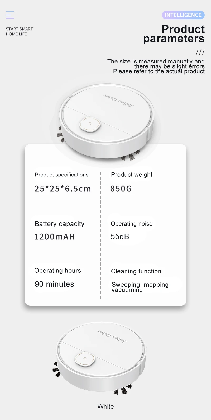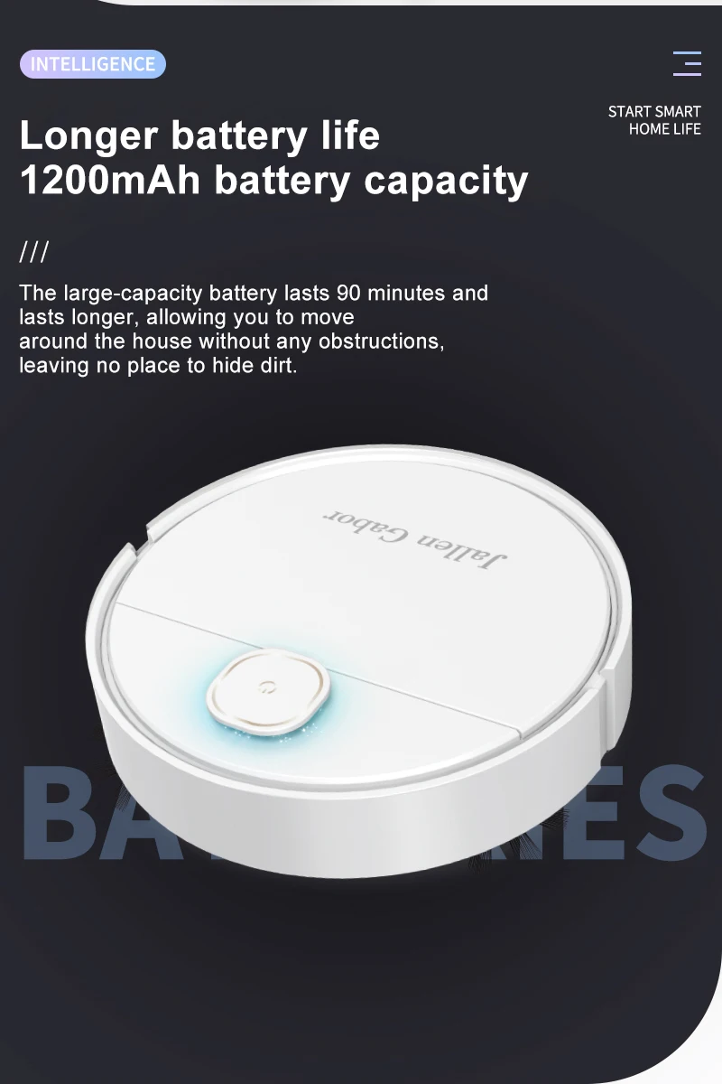 9. Longer endurance, with a 1200mAh battery capacity. Large capacity battery with 90 minutes of battery life for longer endurance, smooth and unobstructed travel throughout the house, with dirt everywhere to hide