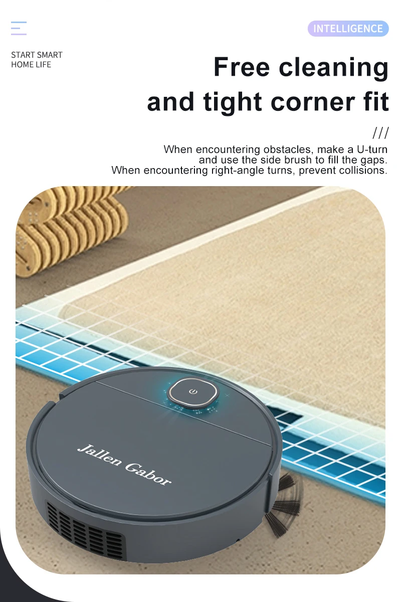4. Free cleaning, tightly fitting corners. When encountering obstacles and turning around, fill the gaps with an edge brush; Encounter right angle turns to prevent collisions