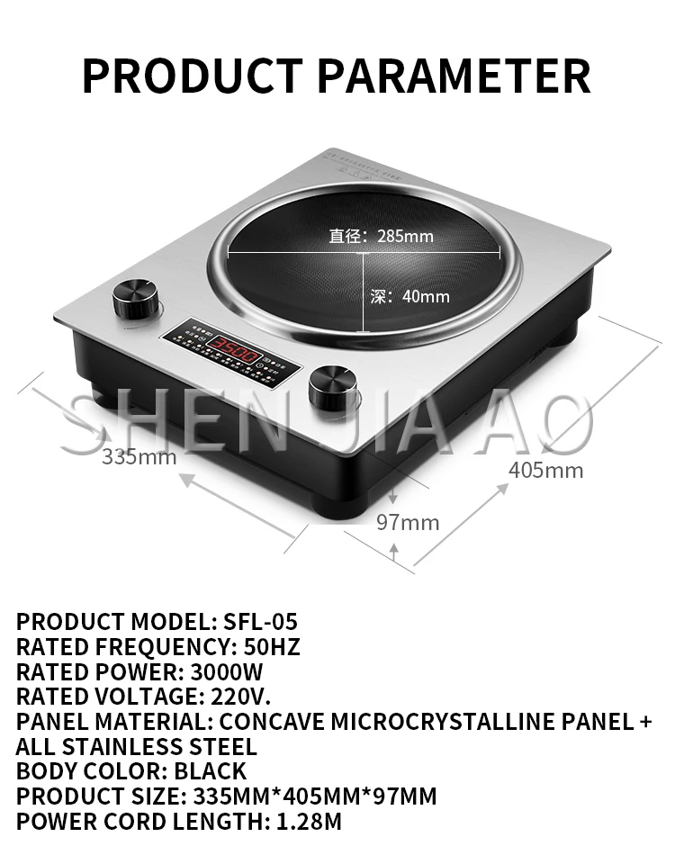 Product model: SFL-05 Rated frequency: 50Hz Rated power: 3000W Rated voltage: 220V. Panel material: concave microcrystalline panel + all stainless steel Body color: black Product size: 335mm*405mm*97mm Power cord length: 1.28m