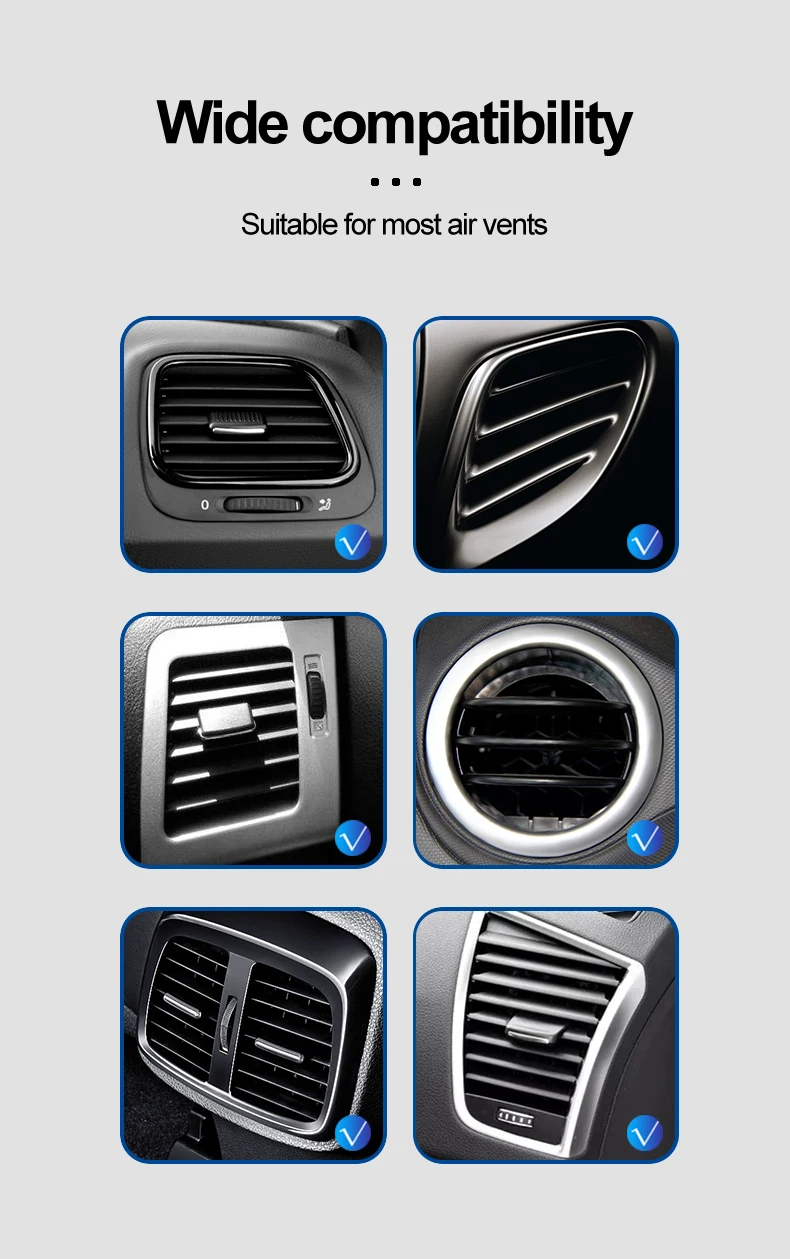 Safe Installation: This car phone holder is equipped with an upgraded version of the ventilation clip, which can securely fix your smartphone on the car’s vent.