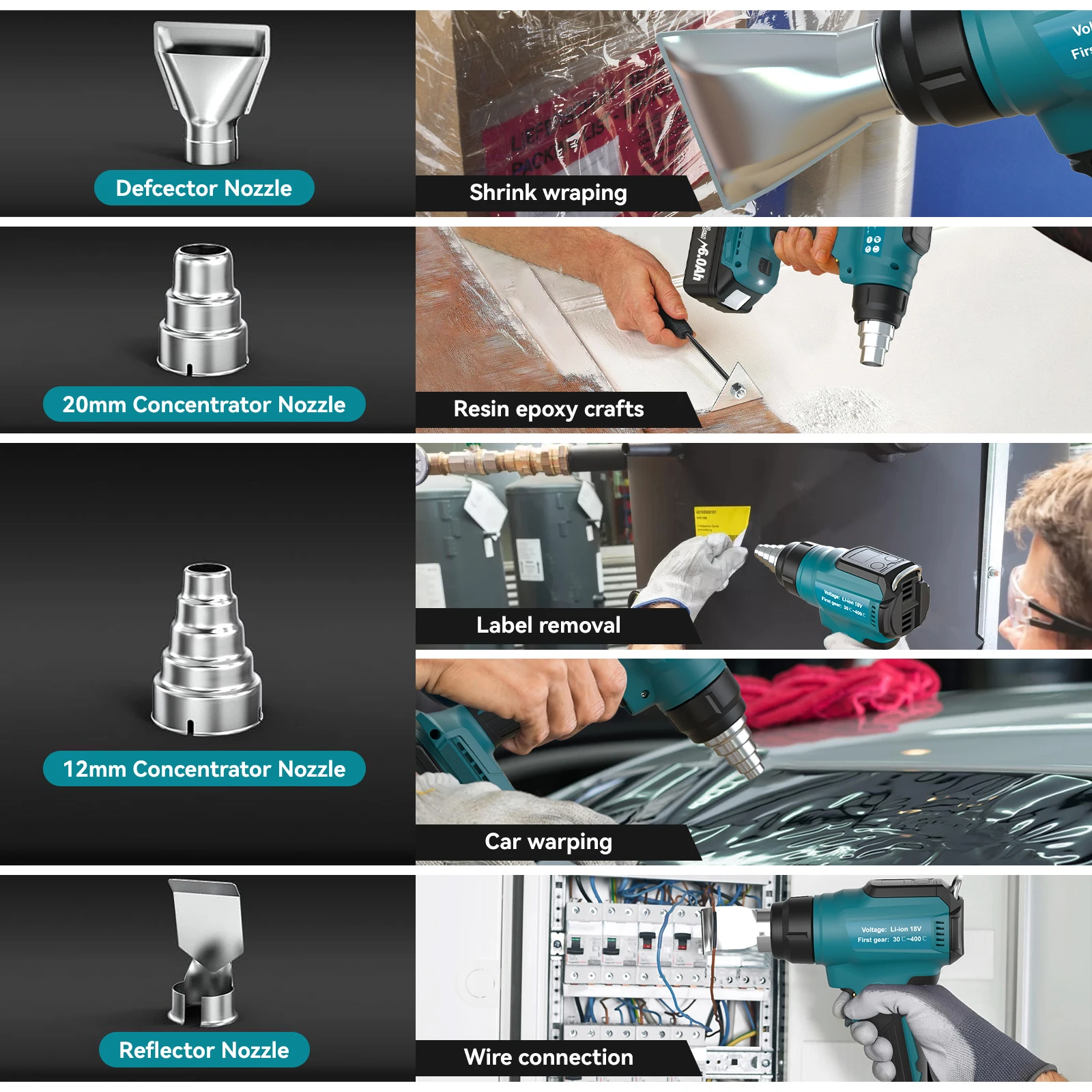 The heat air gun kit for crafts adopt of high quality material, features overload protectors, overheat protection, built-in low-voltage protection to avoid damaging your heat guns and circuitry. Designed with a Lock-on Button, after activated, press the button to keep the heat gun running, truly free your hands. Portable Cordless design makes the Heat Gun perfect for high altitude, outdoor, indoor and other environments. No cord, No limits!