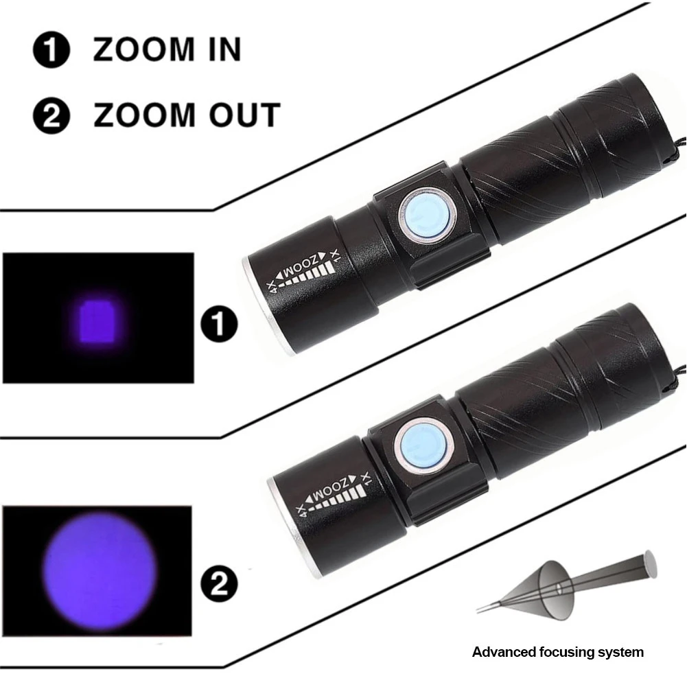 [Quality material]made of aluminum alloy, this blacklight flashlights is durable and strong, long-lasting and easy-heat-losing; Working well in rainy and snowy weather, this portable UV light detector is able to sustain temporary immersion
