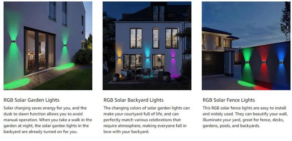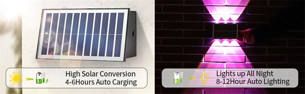 【Dusk to Dawn Solar Outdoor Lights】The high-brightness RGB outdoor solar light adopts high-quality glass polysilicon solar panel, more high energy conversion efficiency. RGB solar wall lights outdoor charging for 4-8 hours in sufficient sunlight, and the working time reaches 8-12 hours. up down outdoor wall lights can lightning courtyards, backyards, patios, gardens, balconies, pools and other scenes to release the beauty hidden in the dark.
