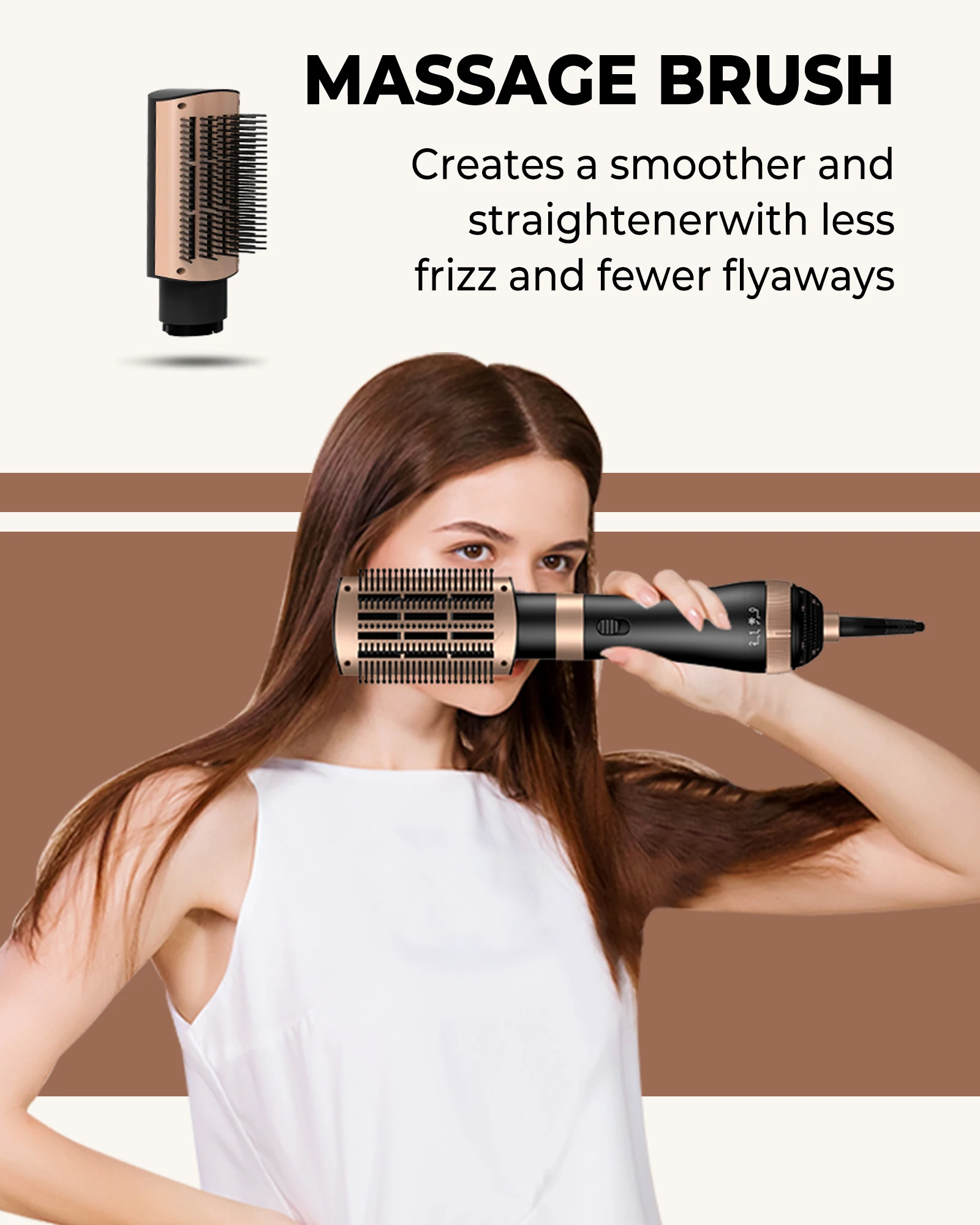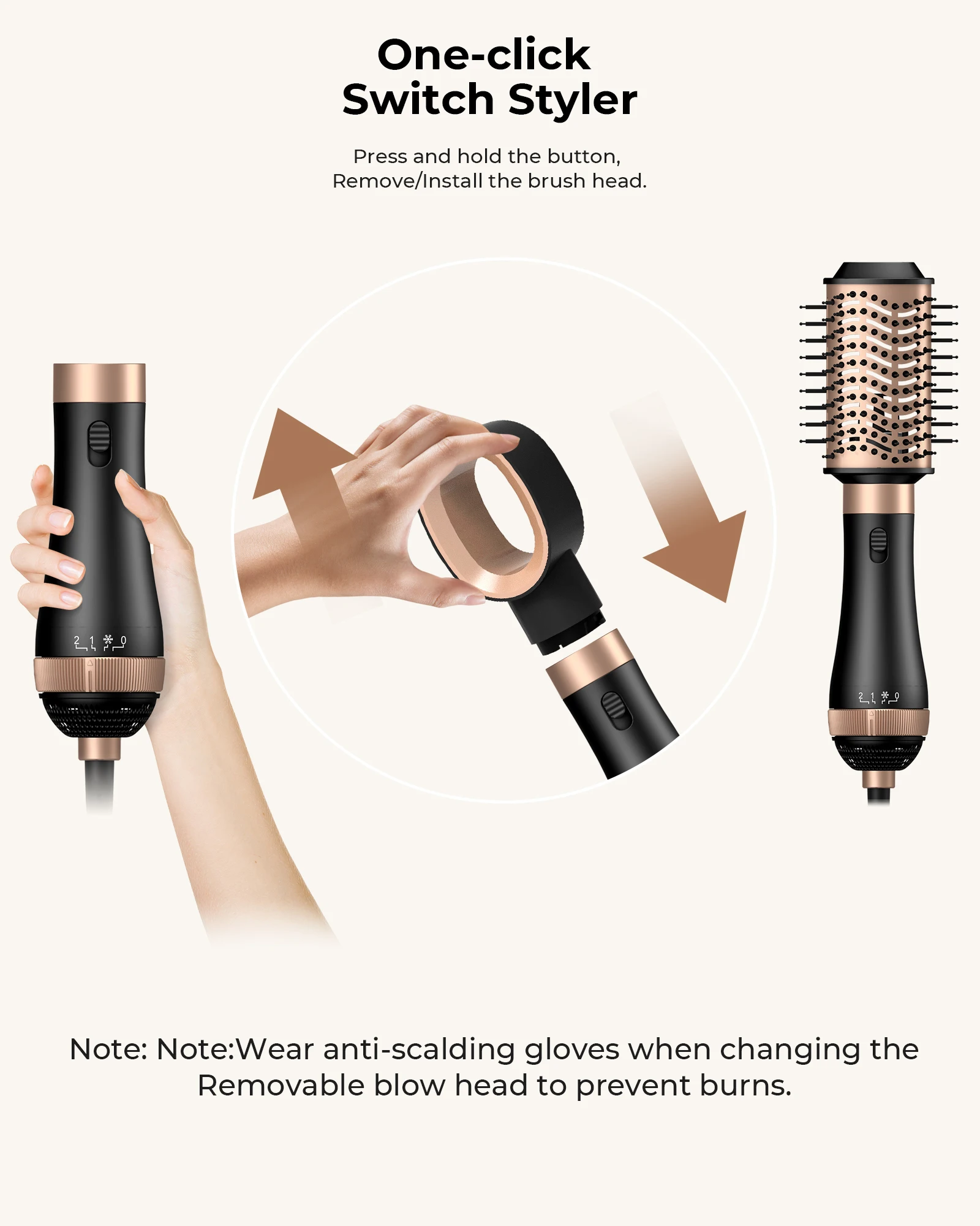 【Interchangeable Styling Attachments】This hair dryer brush set comes with 4 styling attachments, just press the button on the handle and you can easily replace the attachment. This 4 in 1 hot air styler achieve different style needs, also easier cleaning of styling accessories. Hot hair styler can as different hairdressing tools. Suitable for long and short hair and meets all styling needs such as blow-drying, straightening, curling, volume, scalp massage, etc.