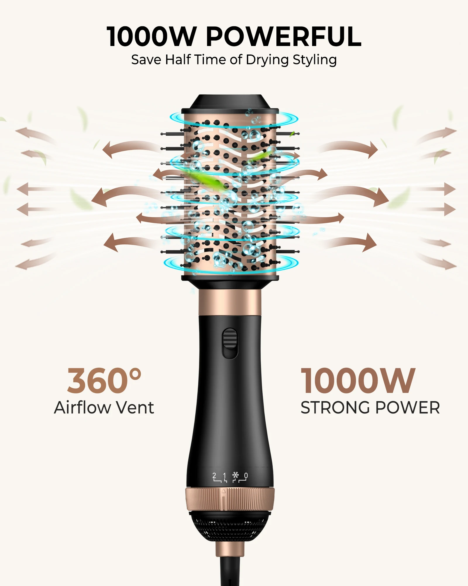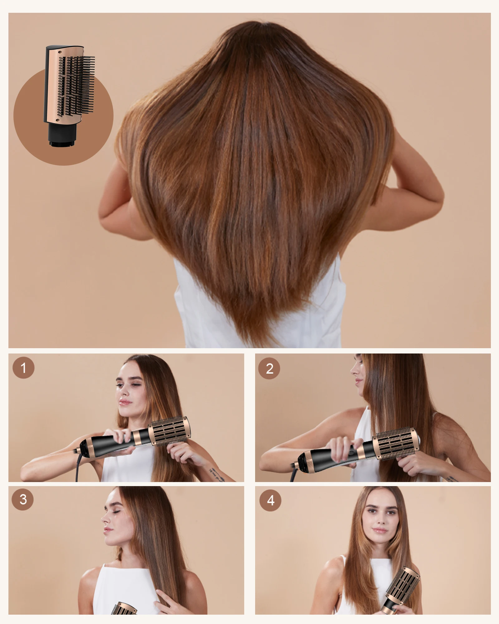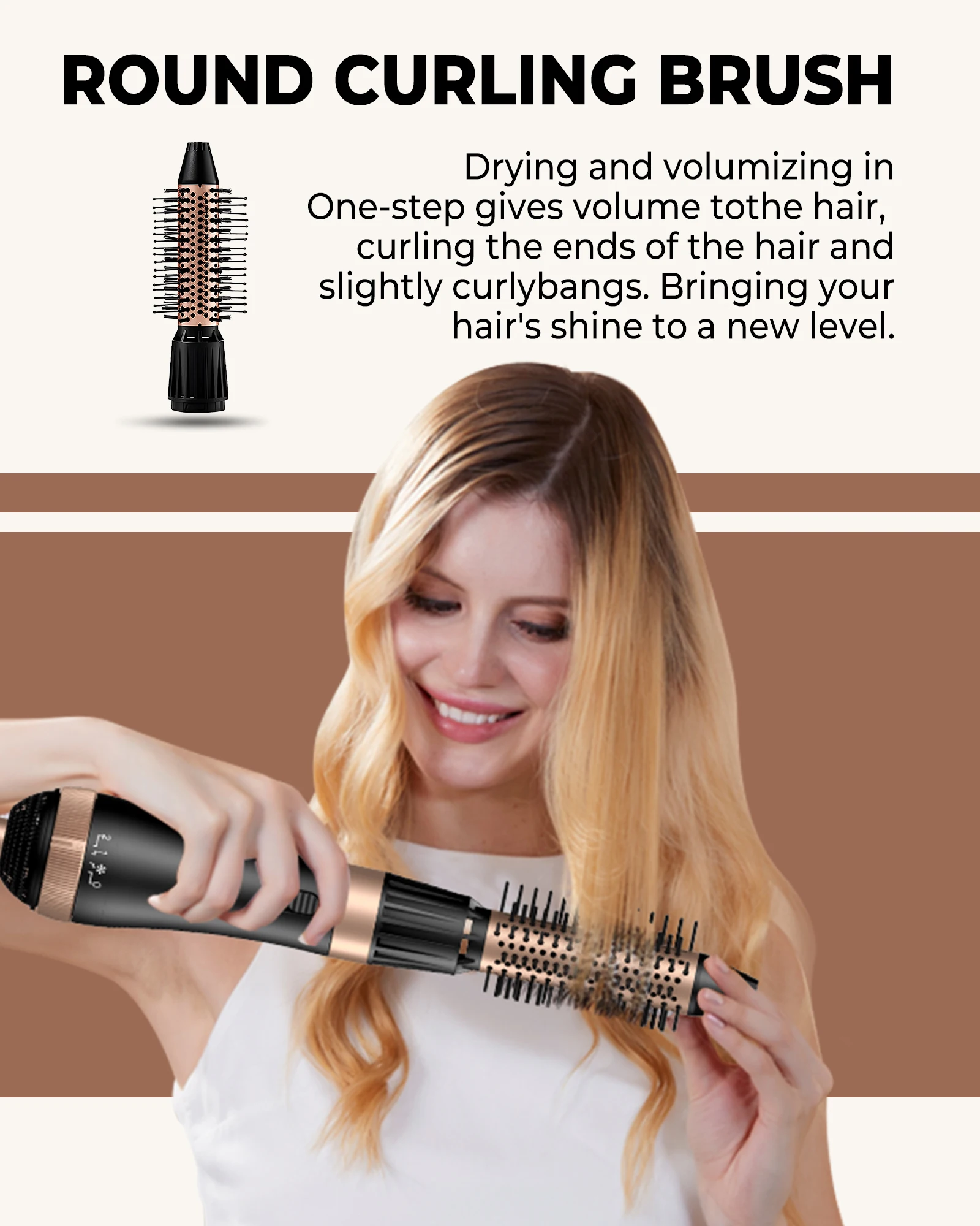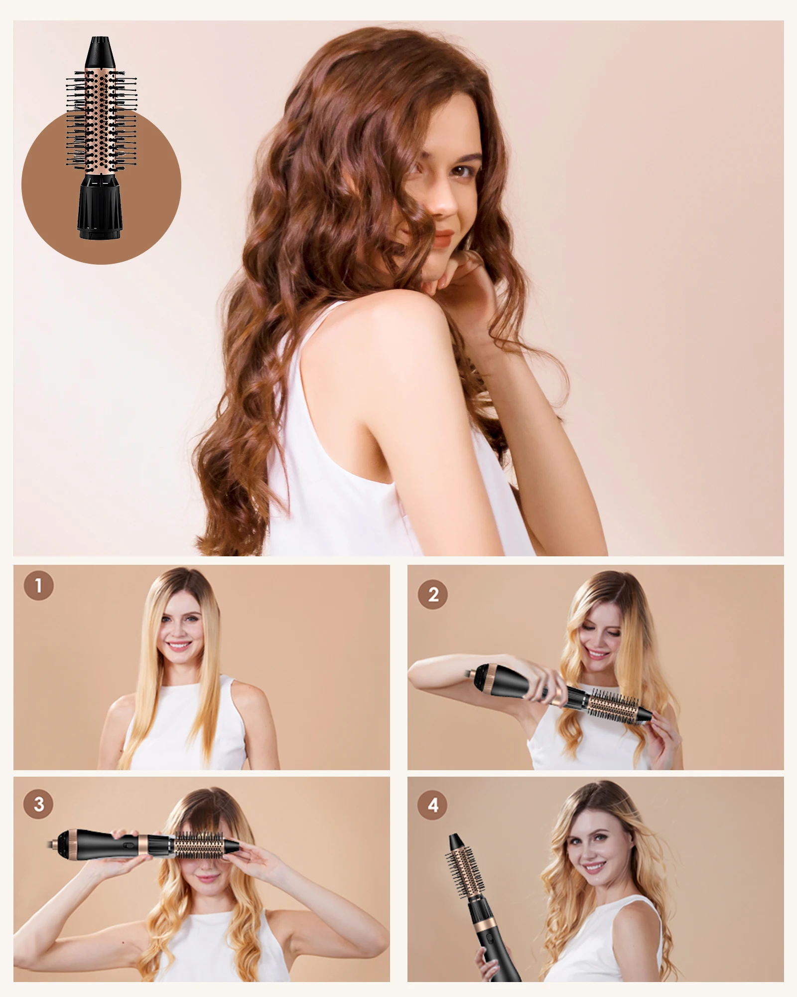 【4 In 1 Hair Dryer Brush Set】This hot air brush is a multifunctional hair dryer brush set that can perfectly meet your multiple styling needs. 4 in 1 hair dryer brush can be used as hair dryer, hair volumizer, curling brush and hair straightening brush. Multiple functions are combined into one excellent practical styling set so you can achieve various beautiful styles efficiently and save time. This blow dryer brush gives you salon-quality results at home with ease!