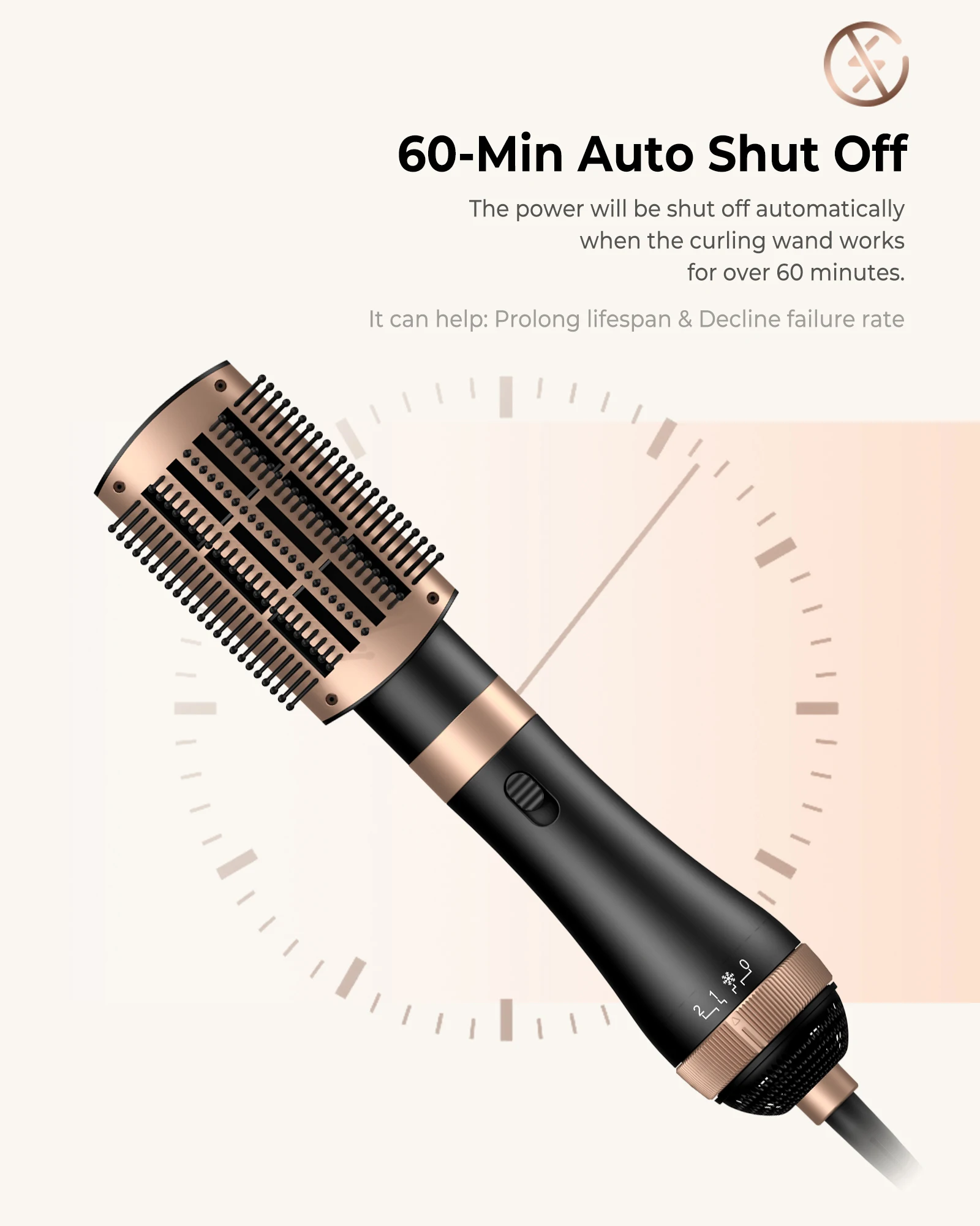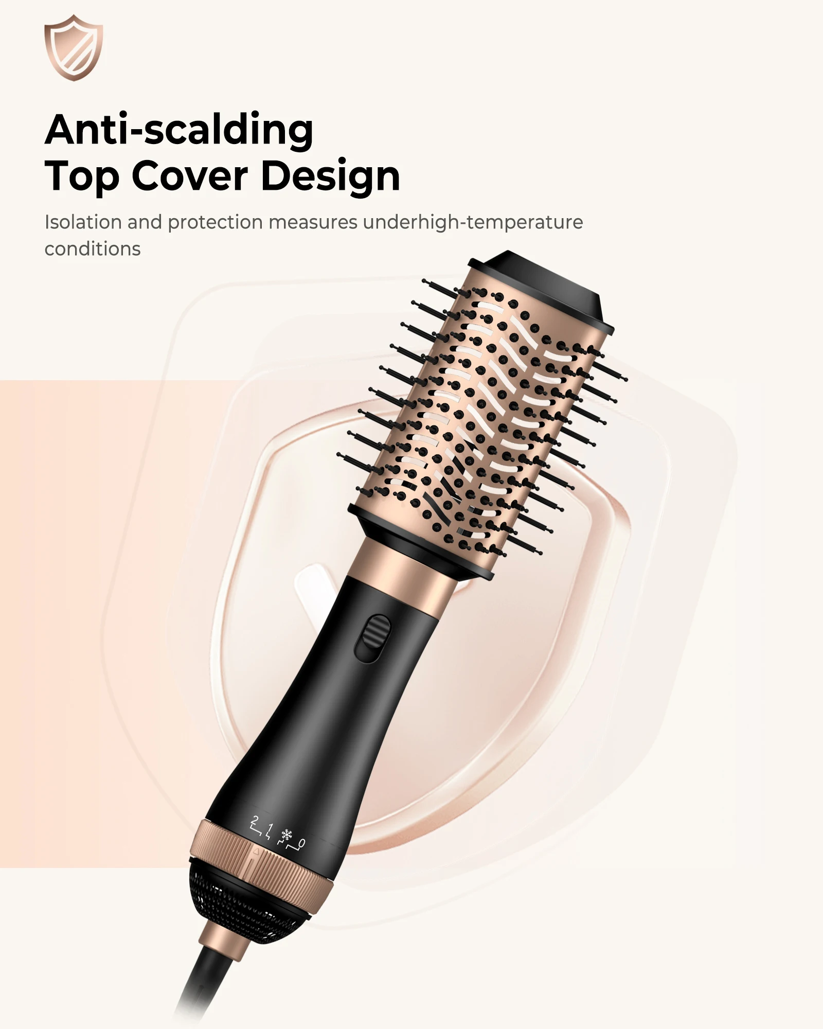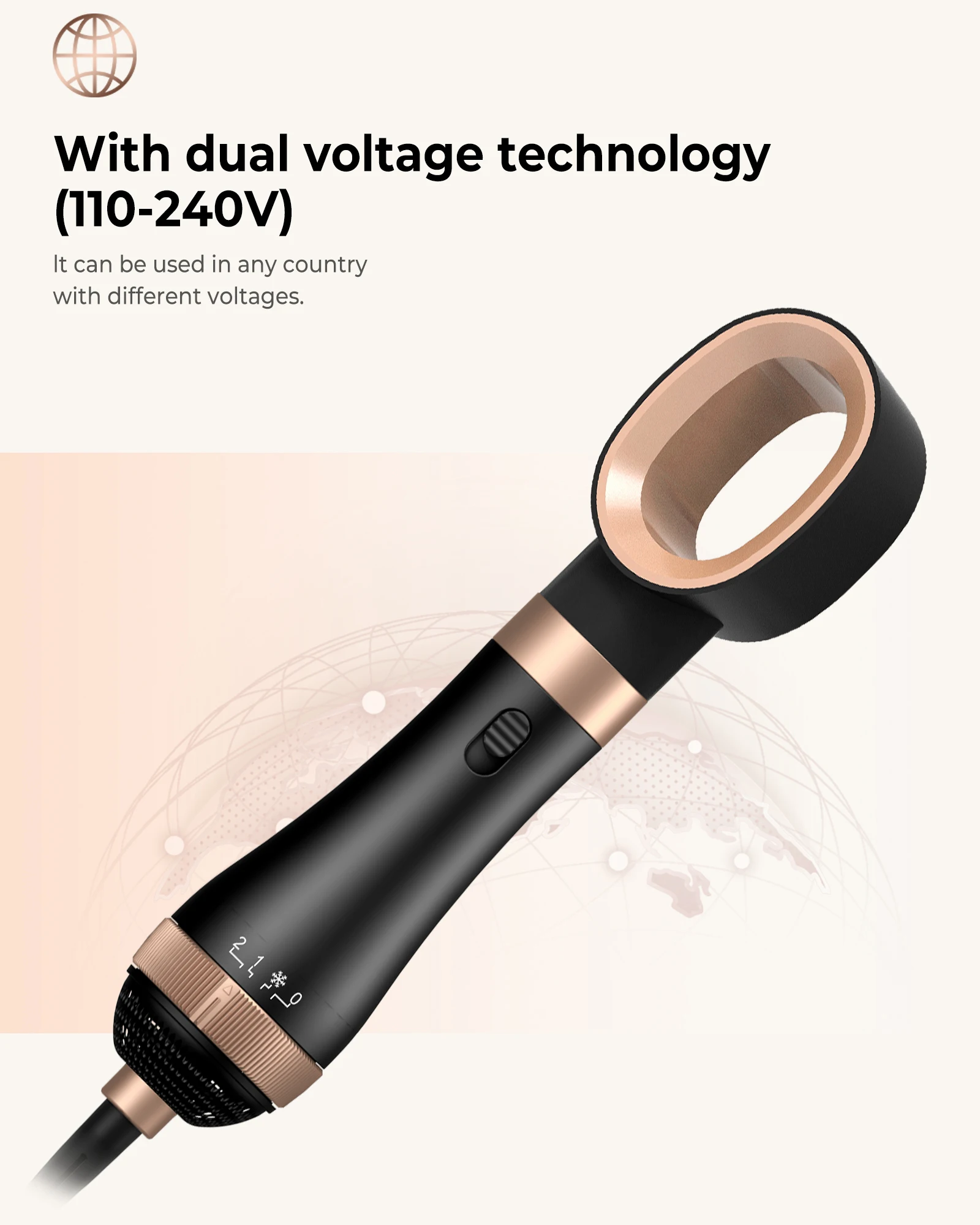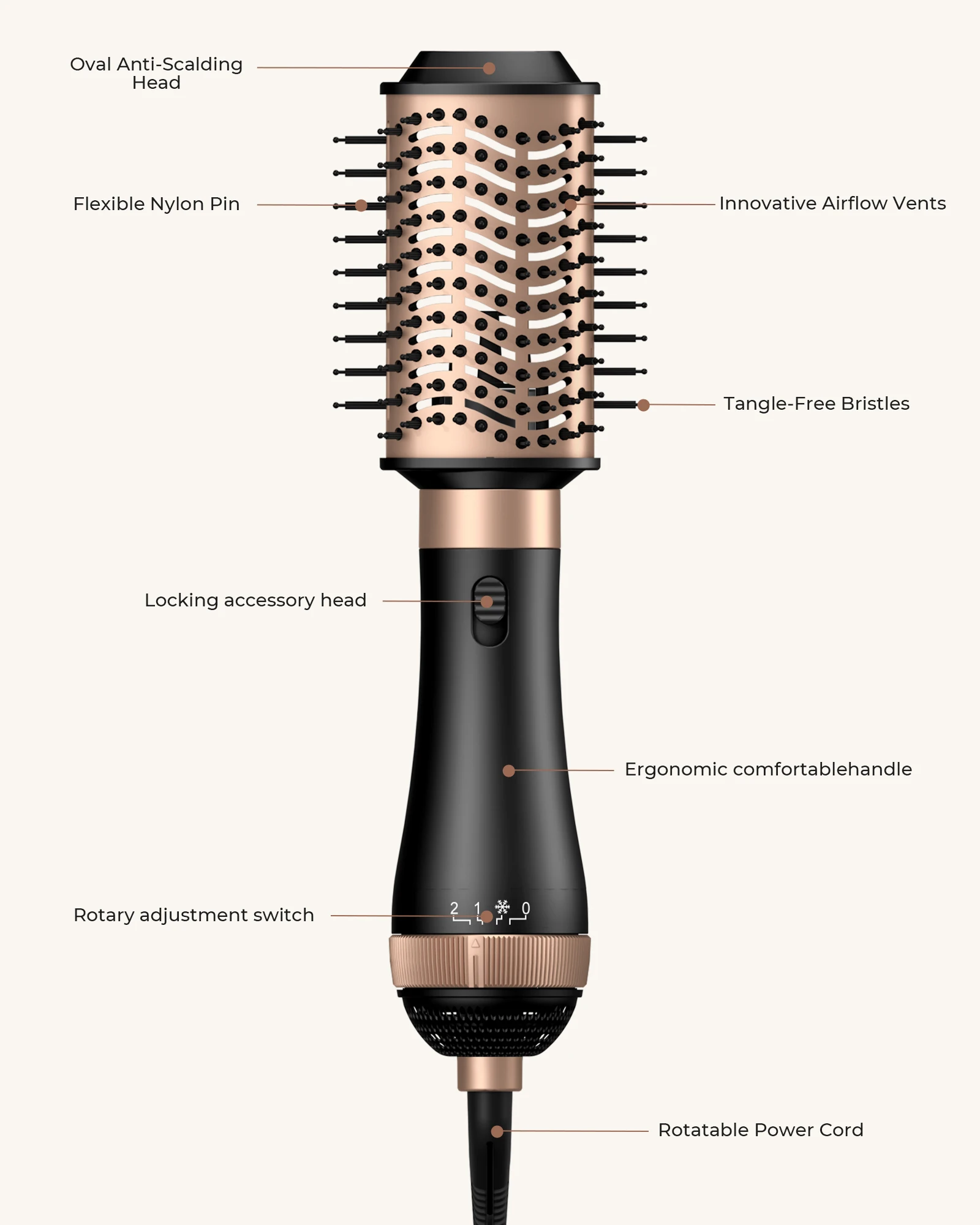 【4 In 1 Hair Dryer Brush Set】This hot air brush is a multifunctional hair dryer brush set that can perfectly meet your multiple styling needs. 4 in 1 hair dryer brush can be used as hair dryer, hair volumizer, curling brush and hair straightening brush. Multiple functions are combined into one excellent practical styling set so you can achieve various beautiful styles efficiently and save time. This blow dryer brush gives you salon-quality results at home with ease!