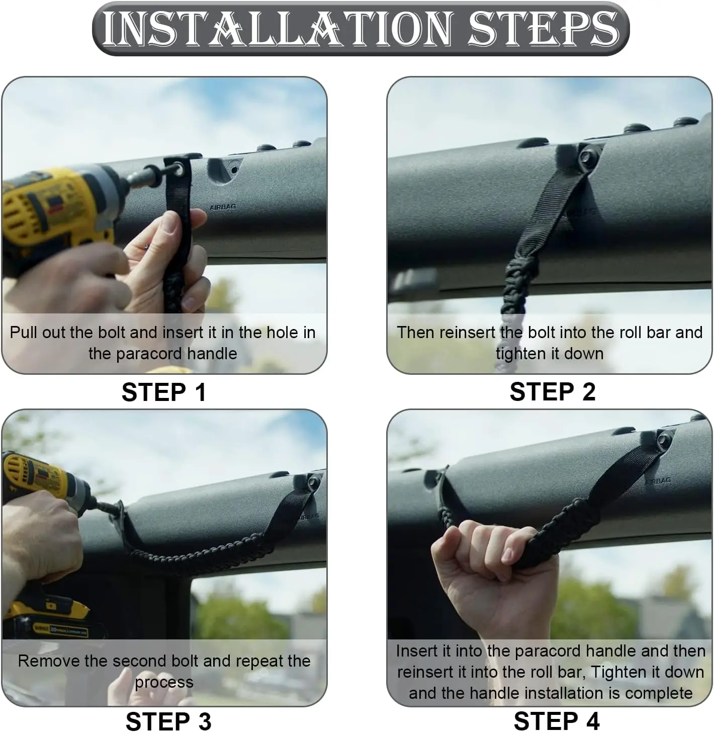 • 【Easy To Install】No need to drill, Our Roll Bar Grab handles match the original car bolt installation point, Install it directly, which is convenient and quick, and it wont damage the interior.