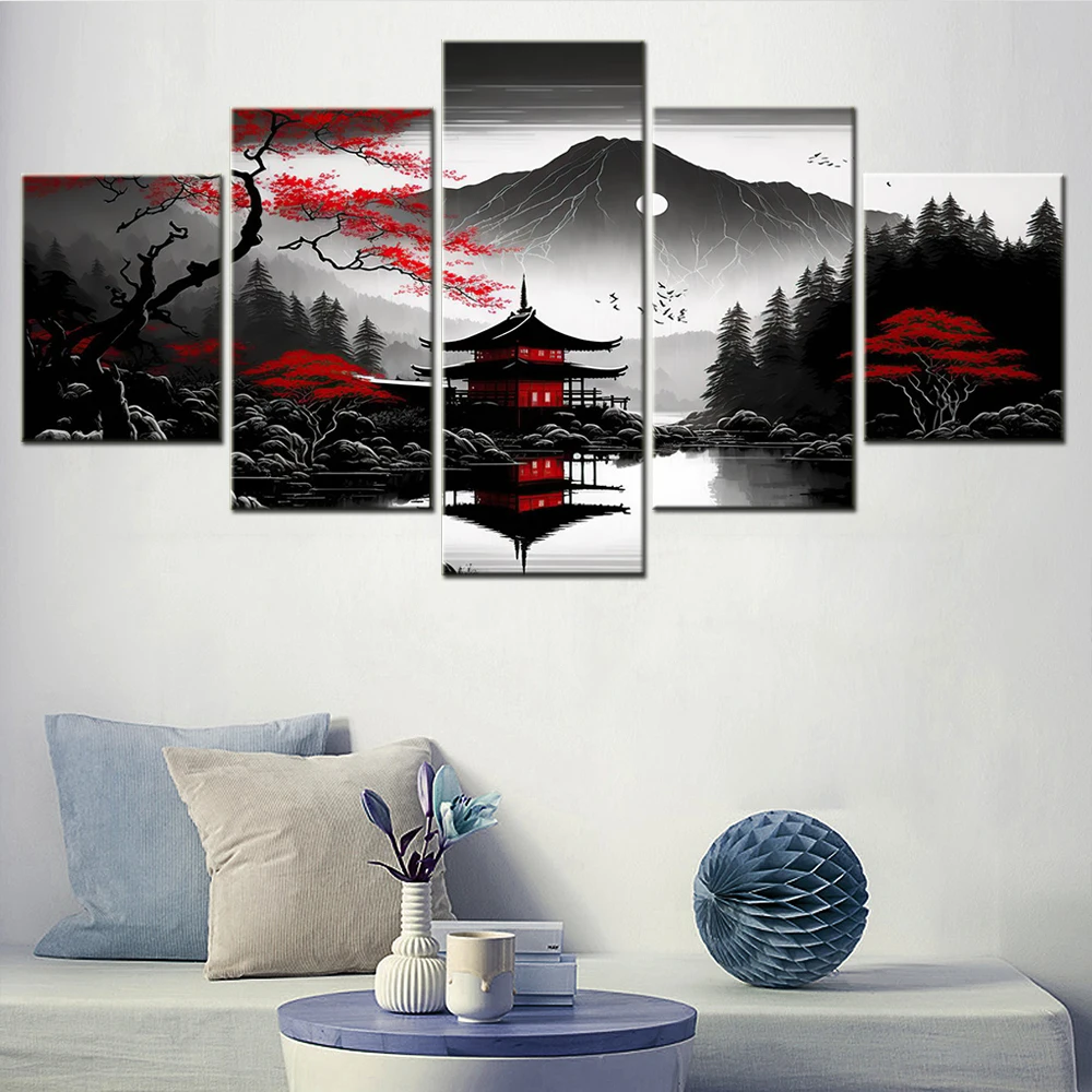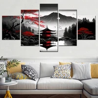 5 Pieces Canvas Landscape Black Red Japanese Mountains Waters Home Decor Pictures Print For Living Room Wall Interior Artwork
