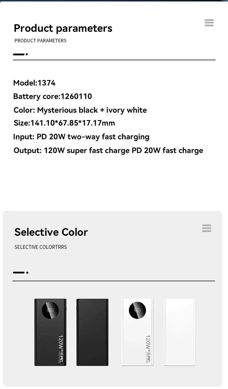 Product: 120W super fast charging power bank with built-in power cord