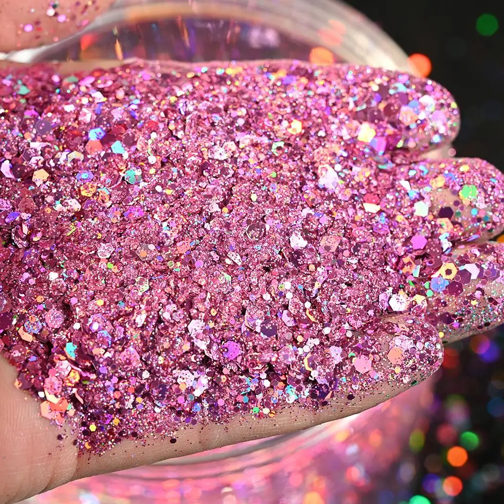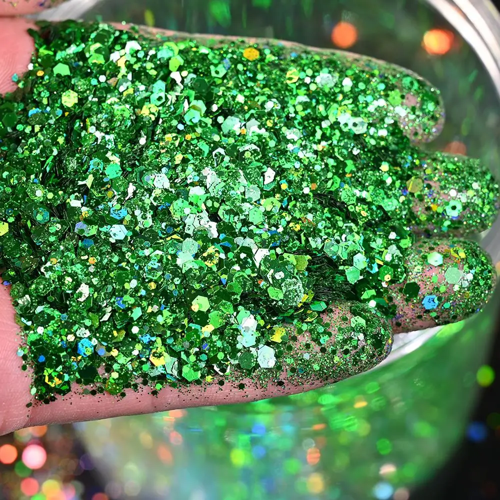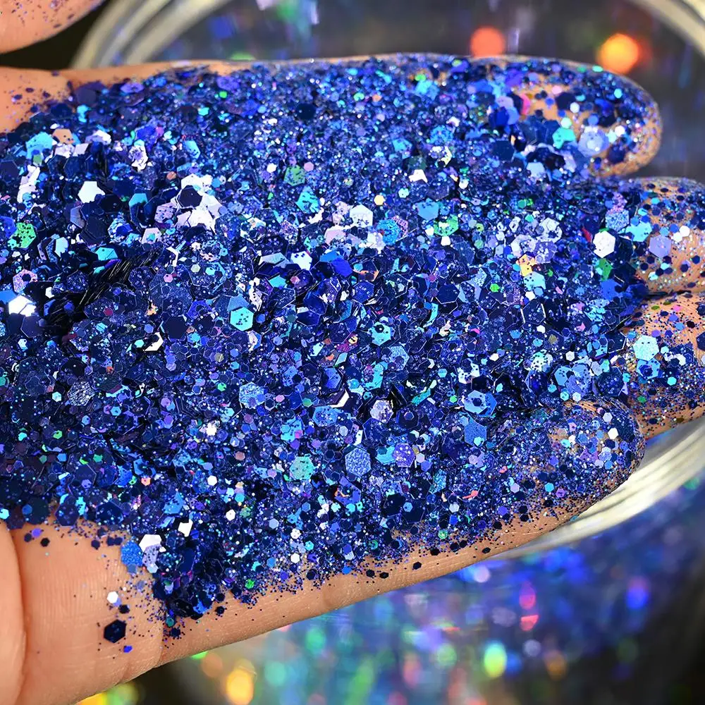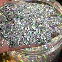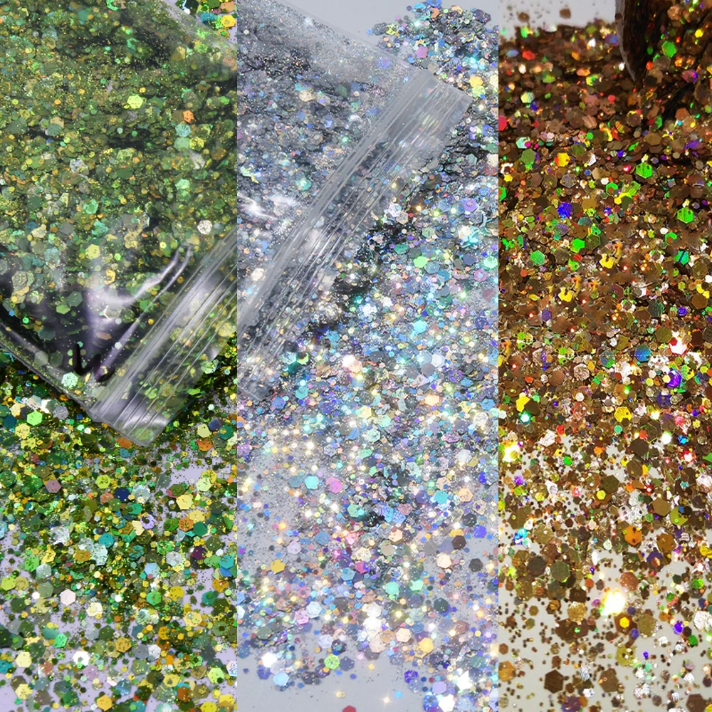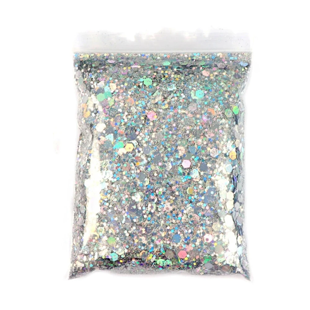 50G Holographic Laser Silver Chunky Nail Glitter Mixed Hexagon Colorful Sequins Powder for Gel Polish Loose Bulk Chunky Glitters