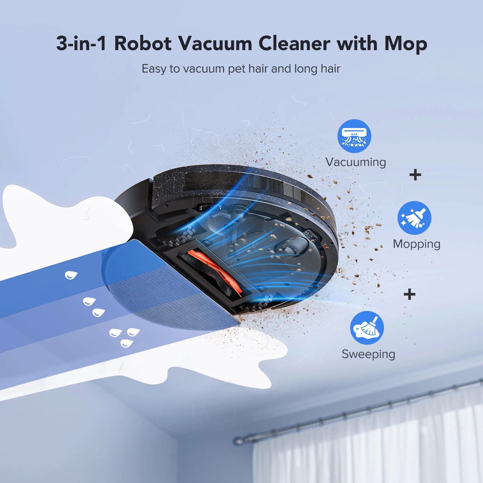 3 in 1 Robot Vacuum and Mop Combo: The L20 robot Vacuum can sweep, vacuum and mop the floor at the same time, saving 30% of cleaning time.The mop and vacuum robot is equipped with a 250ml electronically controlled water tank, with 3 levels of water volume adjustment, no water leakage; The 290ml large-capacity dust-proof Haipa filter dust box eliminates frequent hands-on. Suitable for lots of surfaces, hard floors, wooden floors, carpet,etc