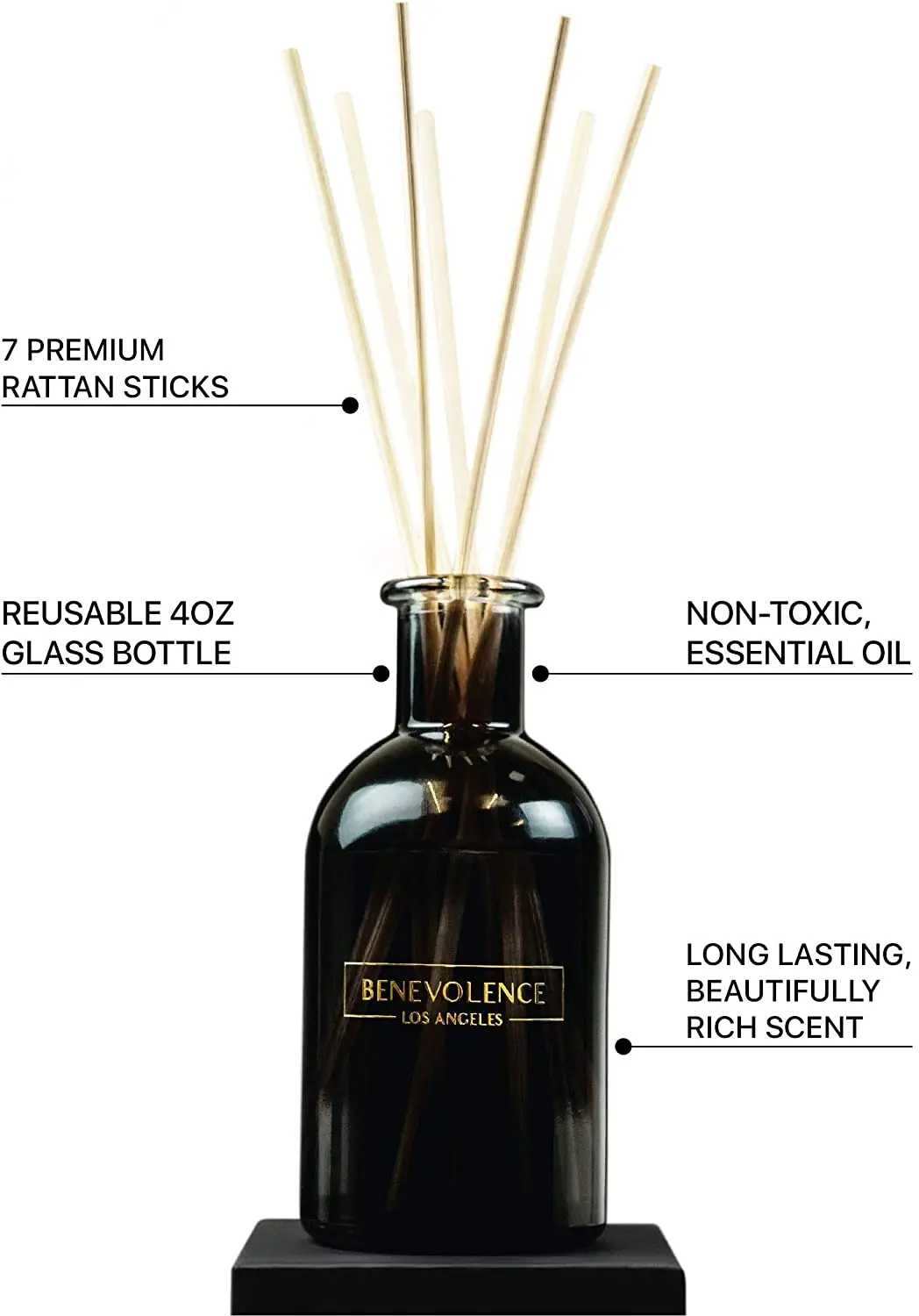 Any essential oil applicable. To intensify fragrance, make sure oil is enough and replace rattan sticks once a week