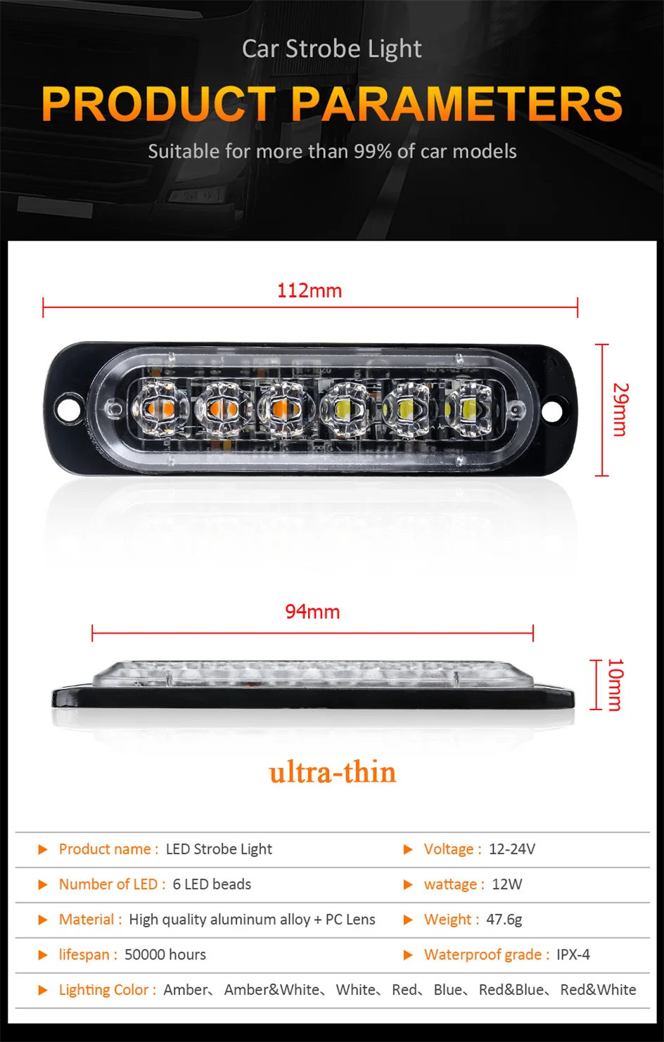 2) Each light has 4 high brightness LED bulbs, 50,000 hours of LED life, wide angle visibility and high intensity strobe, 2 times brighter than before! Improve driving safety and avoid traffic accidents.