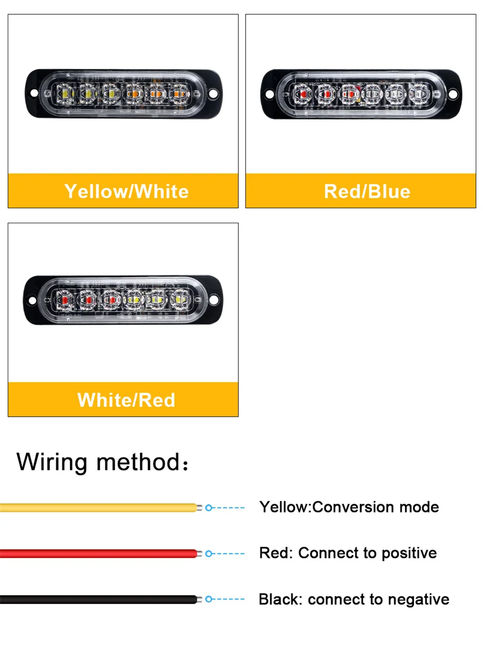 1) The product has 18 flashing modes, such as strobe, normal mode, breathing mode light. (Change mode by yellow line).