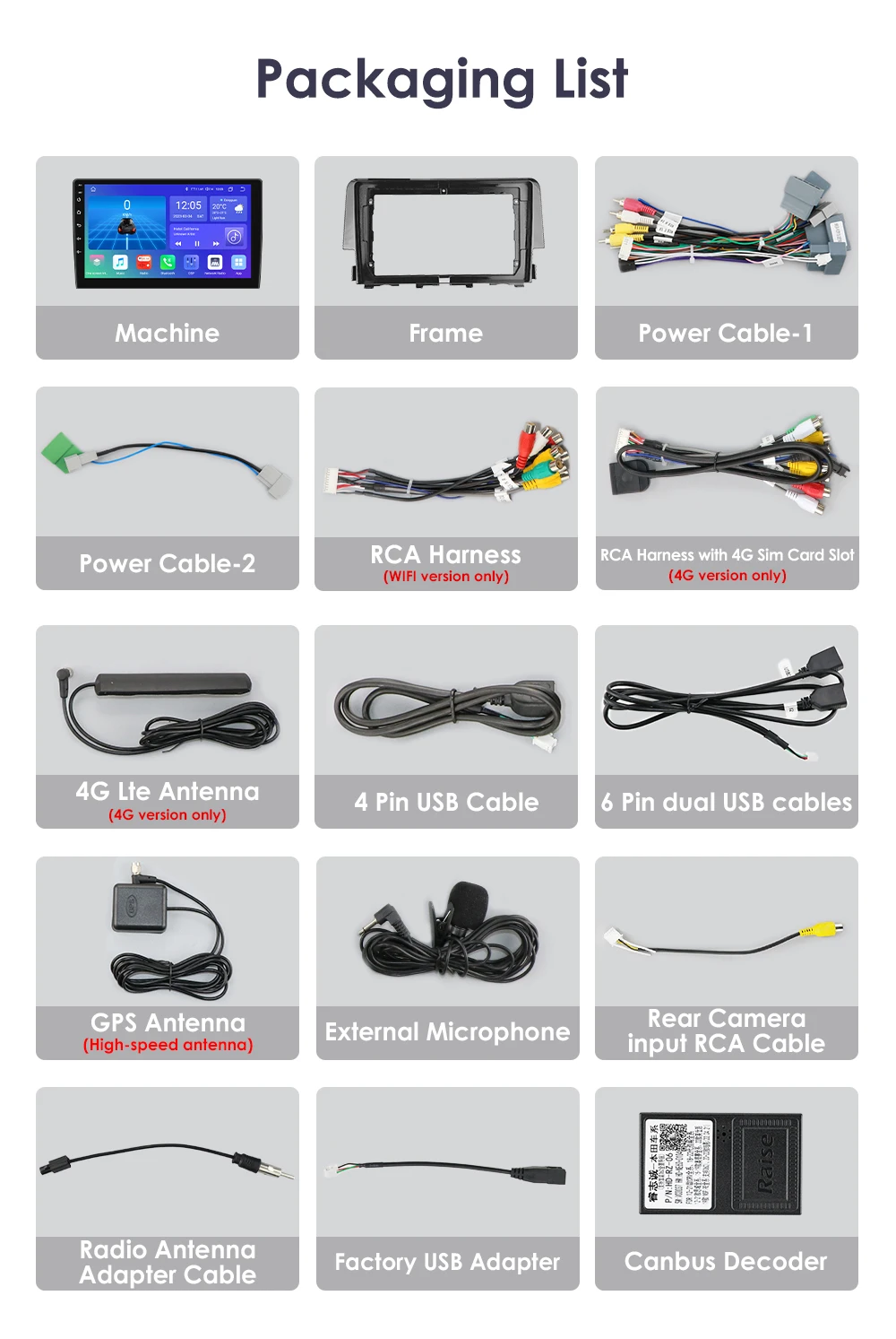 Standard Accessories: which ship with the head unit together(but please pay attension to the red words of accessory whether can get or not which depends on the item option you choose to buy it)