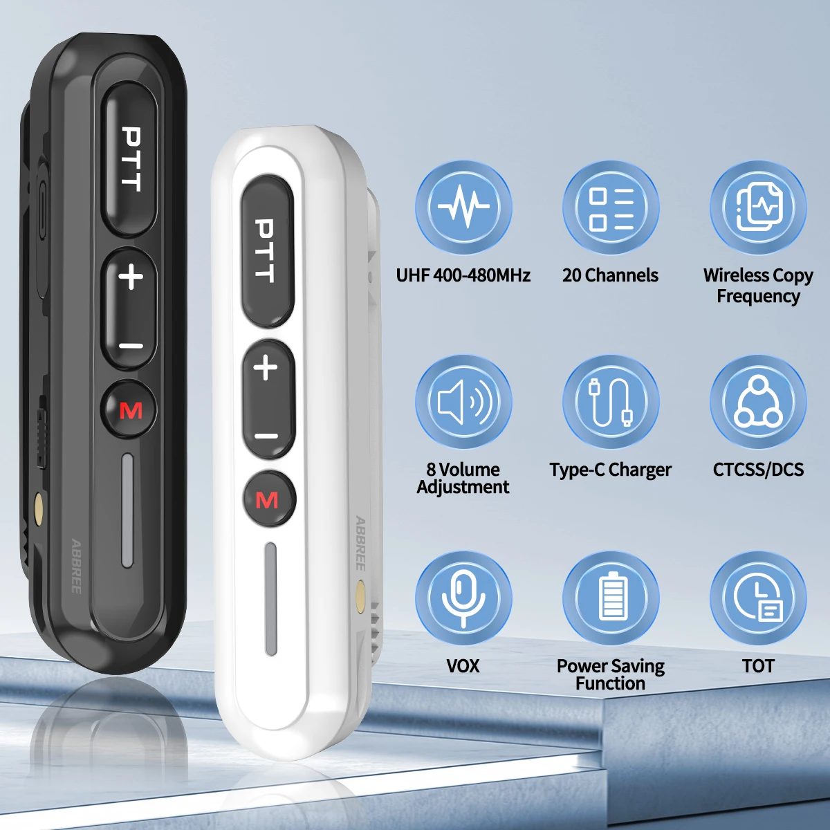 AR-W5 is collar clip mini walkie talkie that can be clipped onto the collar, chest, or pocket. With VOX function, it does not require handheld use and improves work efficiency.