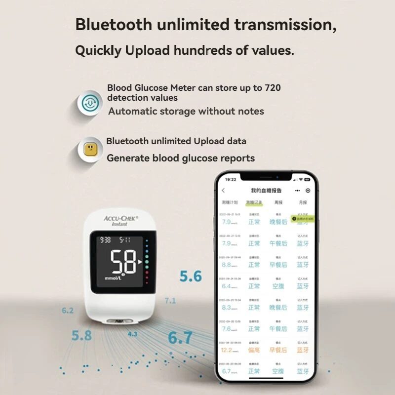 [Meter 100 kit mmol]:1*Meter(mmol/L)+1*Portable bag+1*Lancing device+100 Strips +100 Needles