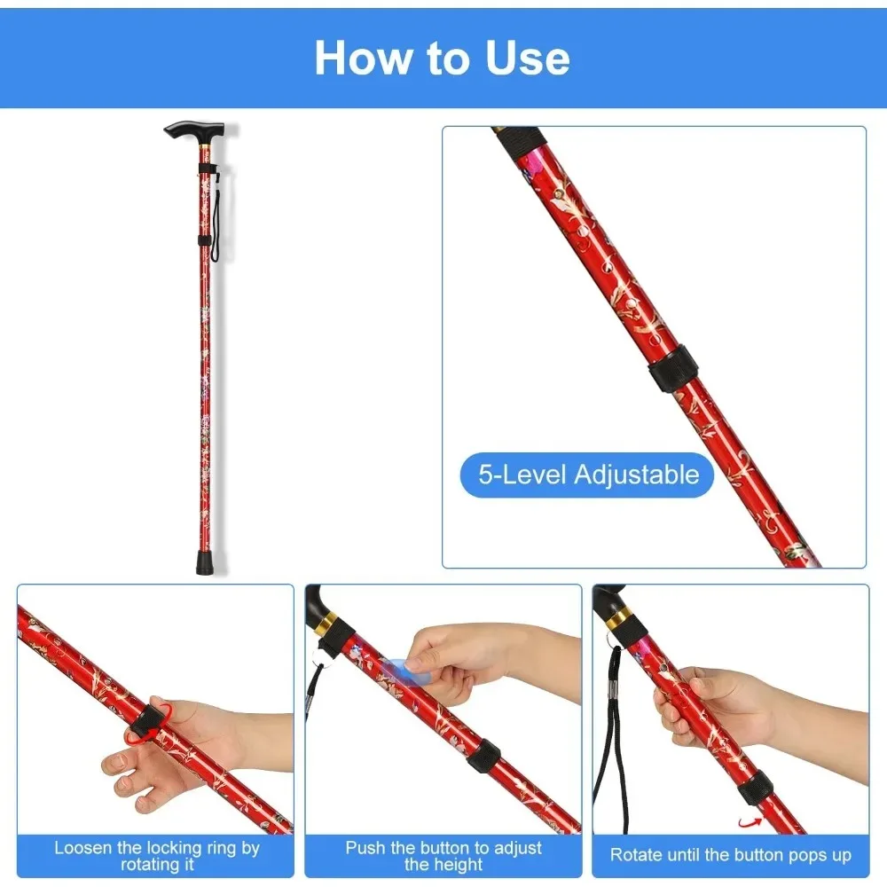 Our folding cane can be easily folded into 5 sections for compact storage and travel; it can also be easily flipped over to ensure continuous and safe use; it is perfect for the elderly, disabled, injured, men and women, indoors or outdoors.