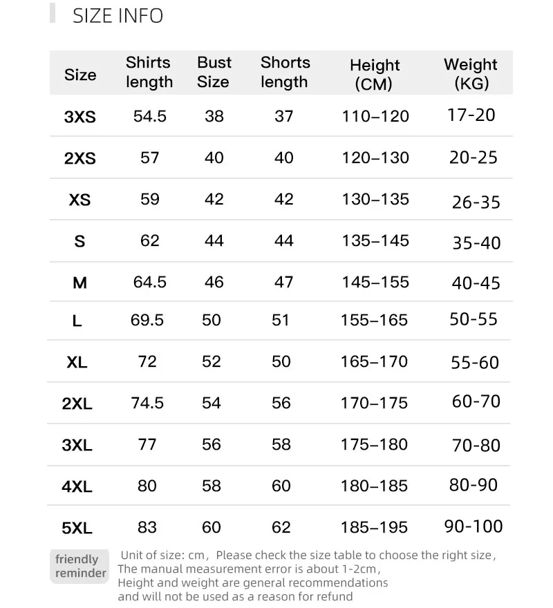 Kids size 3XS: suitable for kids height 110-120cm, weight 17-20kg;