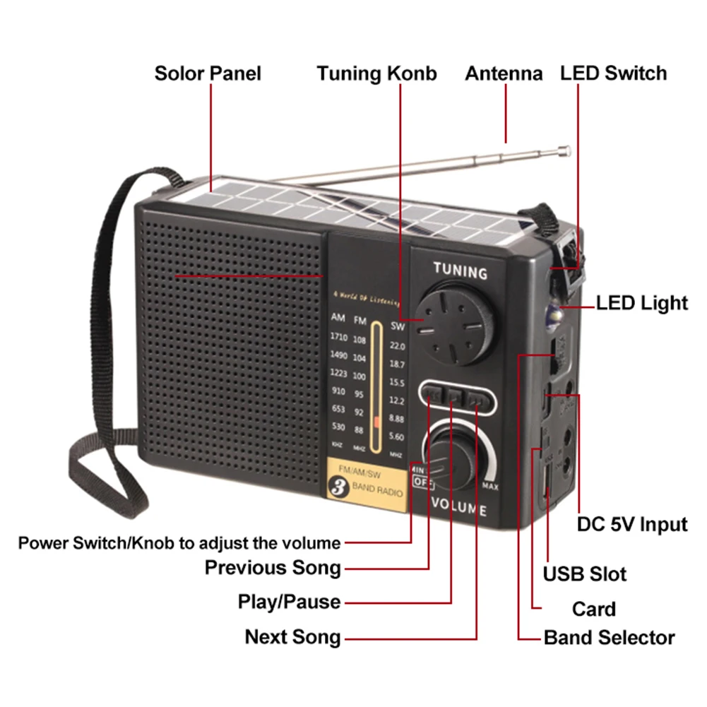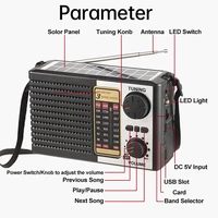 Main functions: Bluetooth-compatible, USB, TF card, FM/AM/SW radio, LED lighting, solar charging