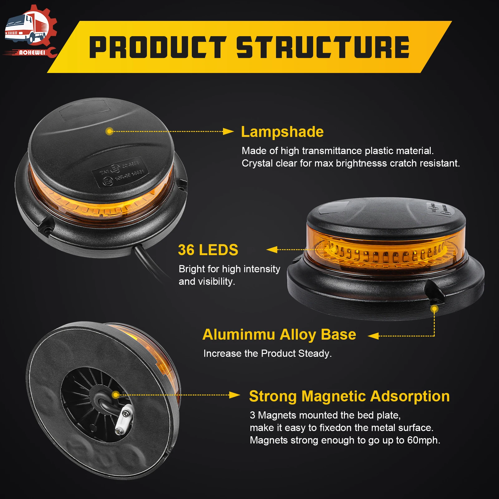 【36 LEDs + 10 Flash Patterns】36 super bright 1W LEDs with high intensity, double voltage 12/24V, 8 flashing patterns and 2 rotating patterns, magnetic mounting.