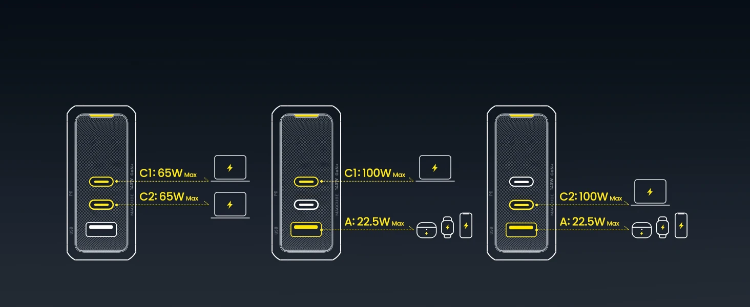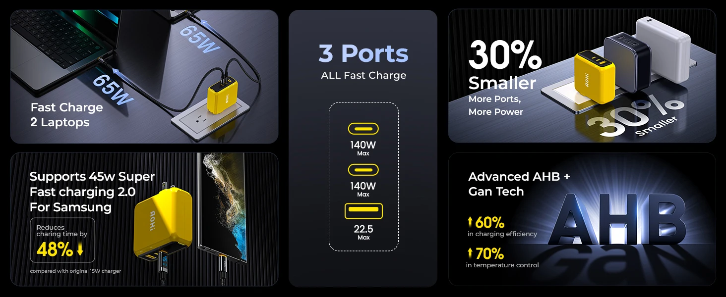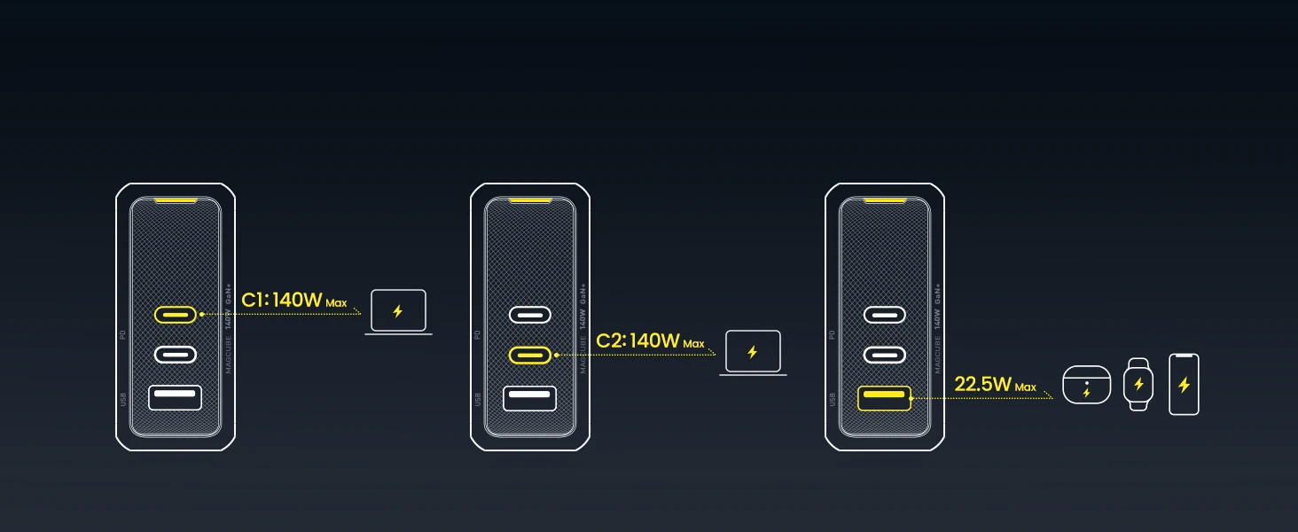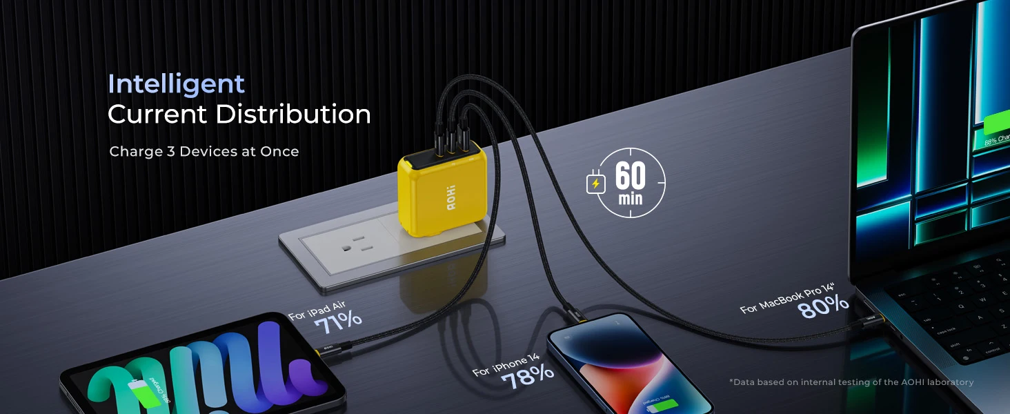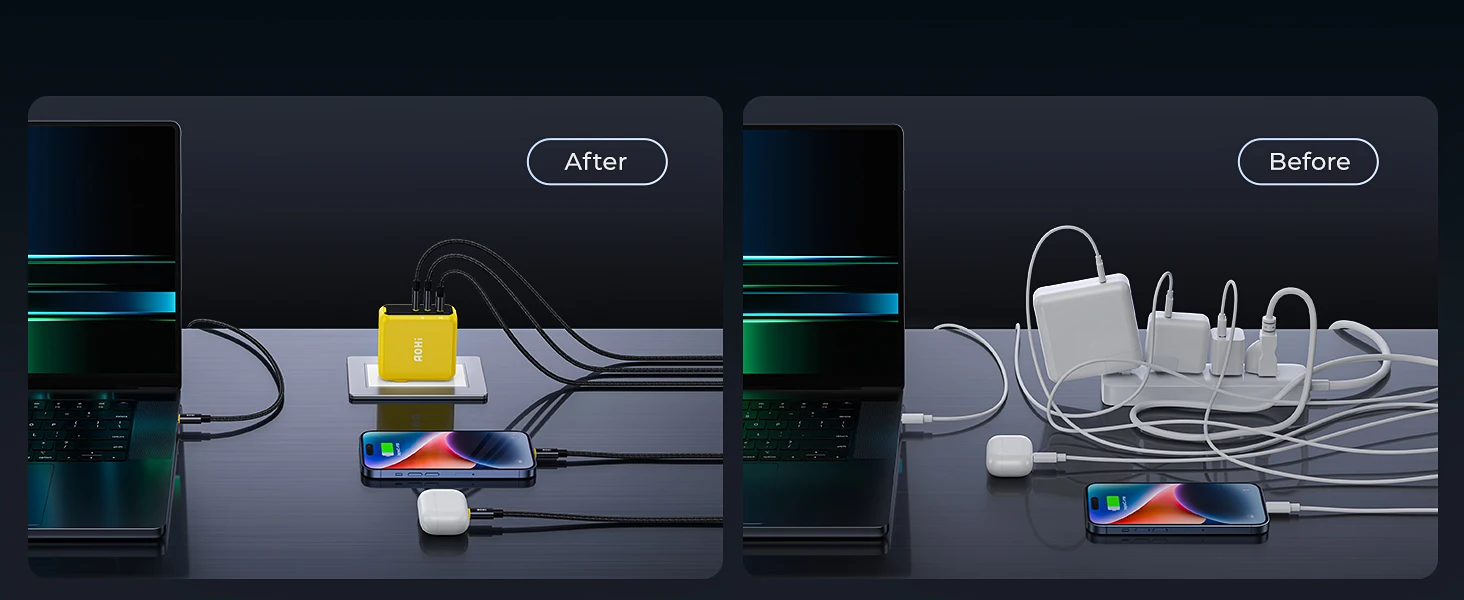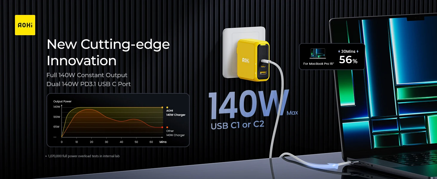The AOHI Magcube Dual-140W PD3.1 USB-C charger is the first to maintain a 140W output, ensuring your device stays in a stable and constant fast-charging state. This 140W Magcube PD 3.1 GaN+ laptop charger utilizes a PFC+AHB asymmetric half-bridge structure to maintain stable output voltage during charging. Both USB-C ports can support 140W fast charging for the MacBook Pro 16″ (must be used with a USB-C to MagSafe 3 charging cable, not included). It’s a true game changer, delivering the most reliable 140W charging solution in the industry