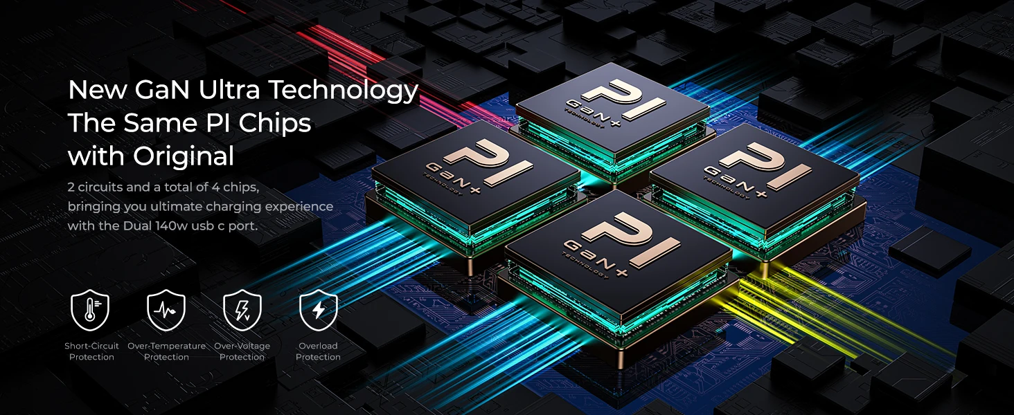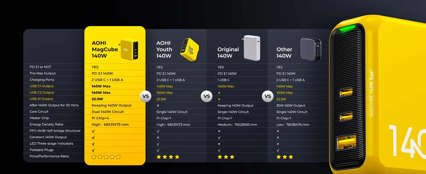 With New Gan Ultra technology, this AOHI Magcube 140W usb c power adapter equiped with a foldable plug and reduces its size by 30% compared to the original and other 140W power adapter. For safer, more stable and constant faster charging, it also uses the same PI chip with the original to make sure all kinds of devices to avoid over-current, over-voltage, over-heating and short-circuit protection, etc. All of these are dedicating to let you feel at ease when charging