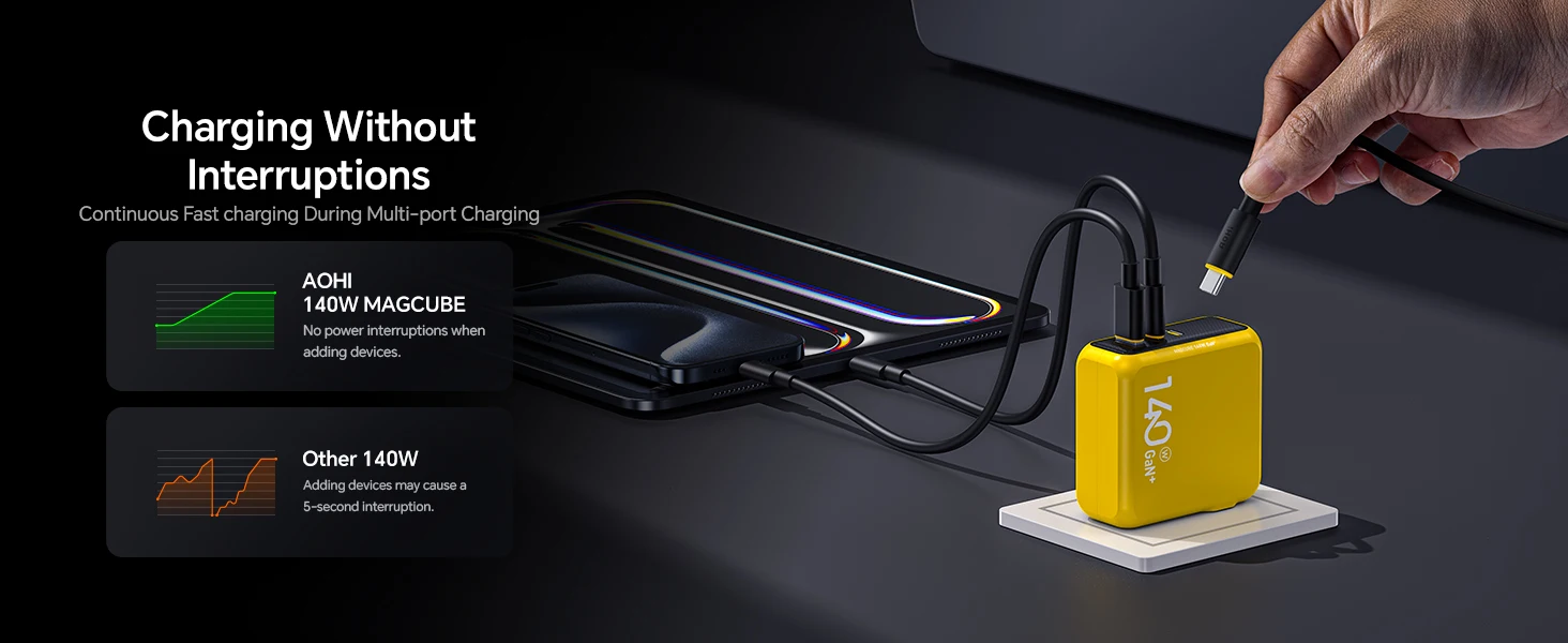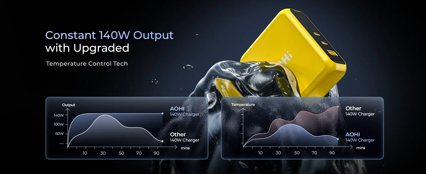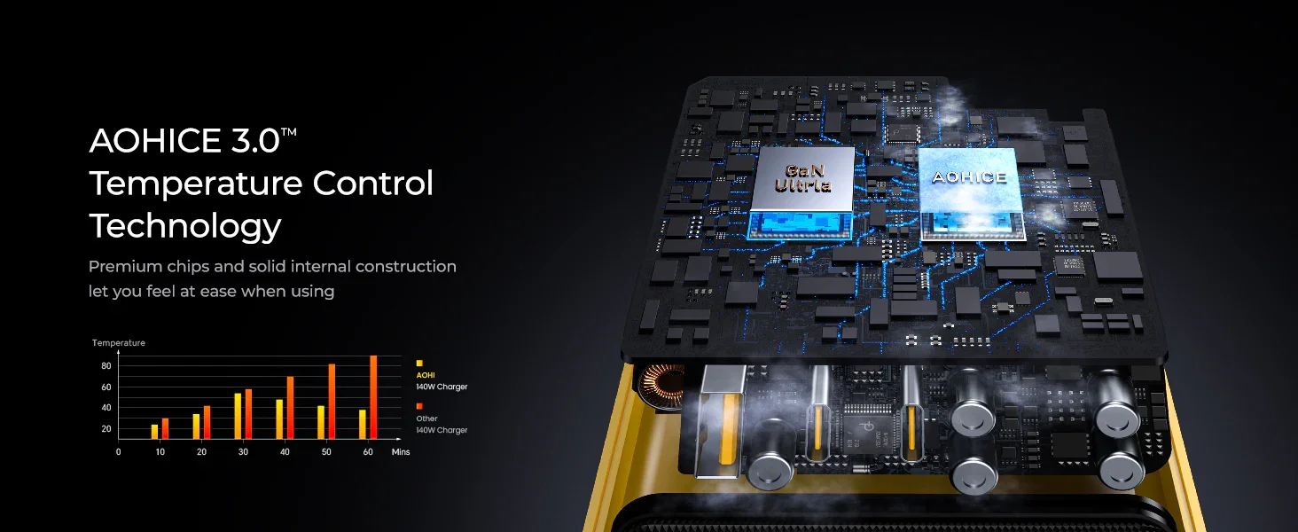 With the newly upgraded AOHICE 3.0 temperature control technology, the AOHI Magcube 140W fast charger has passed 1,070,000 full power overload tests. It supports high power output while ensuring real-time temperature control and rapid heat dissipation, safeguarding your devices from overheating. This technology also ensures long-term longevity and safety for your charger. Unlike the LLC structure used by other 140W chargers, the PFC+AHB asymmetric half-bridge structure used in the AOHI 140W Magcube charger provides a better experience in terms of temperature and charging efficiency