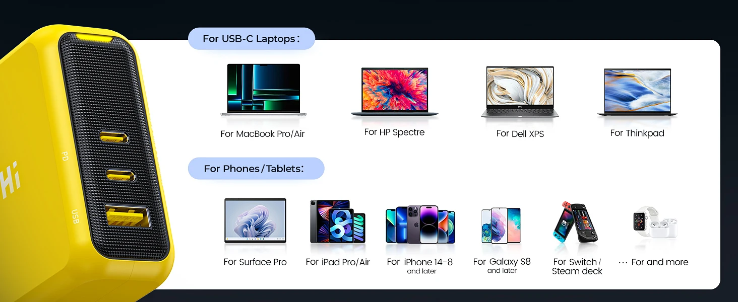 AOHI MagCube 140W Charger is compatible with MacBook Pro 16, 15, 14, 13″, MacBook Air, Dell XPS 15/13, HP Spectre/HP Chromebook, iPad Pro, iPhone 15 Pro/14 Pro Max/13/12, Galaxy S23 Ultra/S22, Switch, Steam Deck, and More; Support Samsung 45W super fast charge 2,0 charging protocol; Dell laptop series cannot be charged at full speed due to charging protocol restrictions